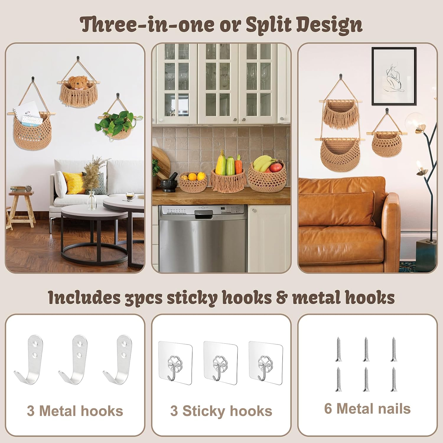 3 Tier Hanging Fruit Basket for Kitchen, Handmade Woven Cotton Hanging Wall Basket for Fruit Vegetable with 6 Hooks, Boho Style Over The Door Organizer for Living Bathroom Bedroom