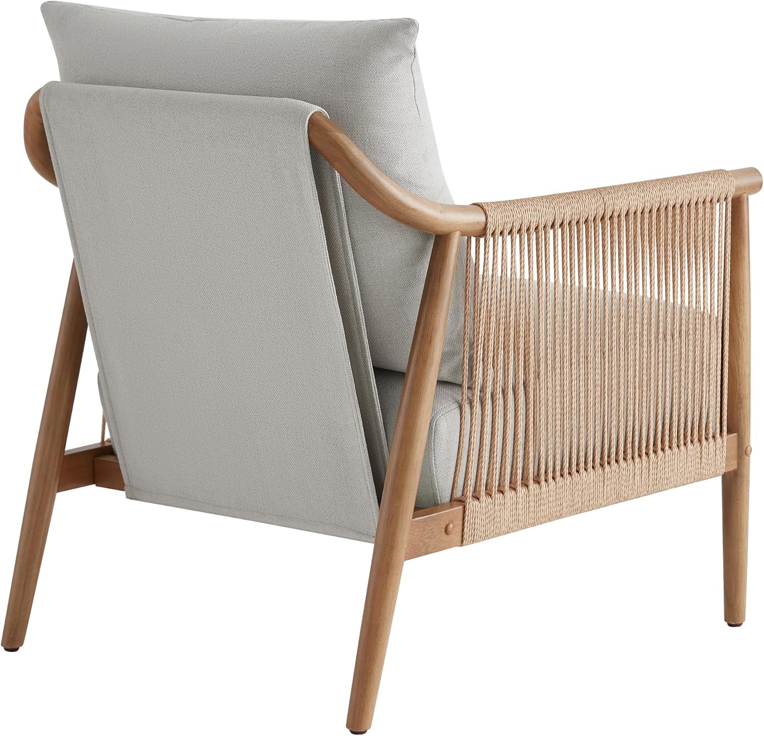 - Braid Chair with a Boho Vibe - Featuring angled armrests braided with paper cord, a nod to timeless bamboo design patterns, this chair infuses indoor spaces with a refreshing, natural ambiance. The chair's design ensures enduring comfort, thanks to the plush back cushion paired with a medium high backrest. It is a versatile addition to any living space and is perfect for beach house, deftly bridging the gap between outdoor charm and indoor luxury.