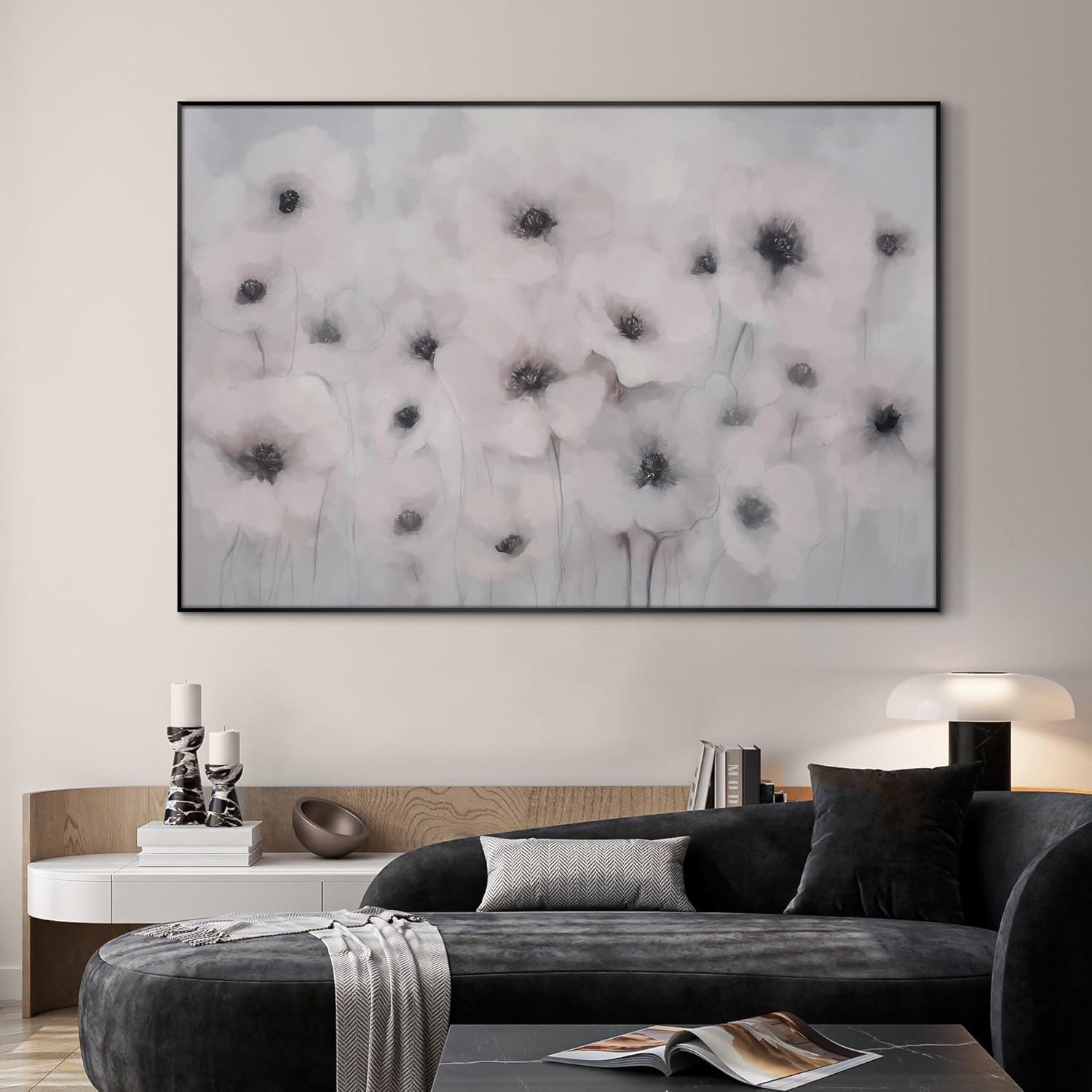 46"x72" Extra Large Framed Wall Art Soft White Poppies Watercolor Floral, Delicate Botanical for Home Living Room Bedroom Decor (Frame Assembly Required)
