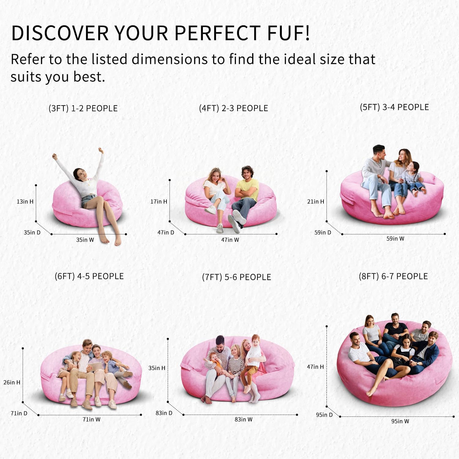 - 【Choose The Perfect Size for Your Space】 Our Bean Bag Sofa Covers Are Available In Six Sizes, From 3ft To 8ft, Catering To Both Kids And Adults.The 3ft (Capacity: 1-2 People),4ft (Capacity: 2-3 People),5ft (Capacity: 3-4 People),6ft (Capacity: 4-5 People),7ft (Capacity:5-6 People),And 8ft (Capacity:6-29 People) Options Ensure You Find The Ideal Fit.Each Size Adds A Stylish Touch To Any Space,Making Them A Versatile Addition To Your Home.