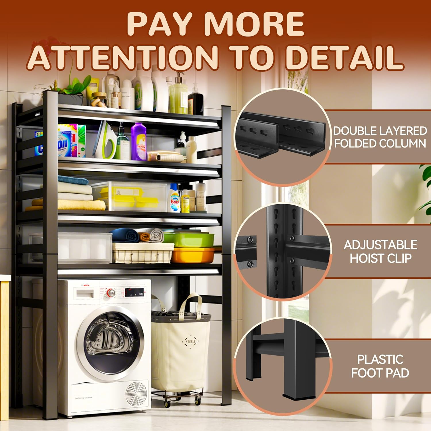- [Fully Customizable for Any Bottle Size] No more storage frustrations! This versatile laundry room storage rack features an innovative snap-on design, allowing you to effortlessly adjust shelf heights. Transform this 5-tier shelf unit to perfectly accommodate everything from large, bulky detergent containers to smaller laundry accessories.
