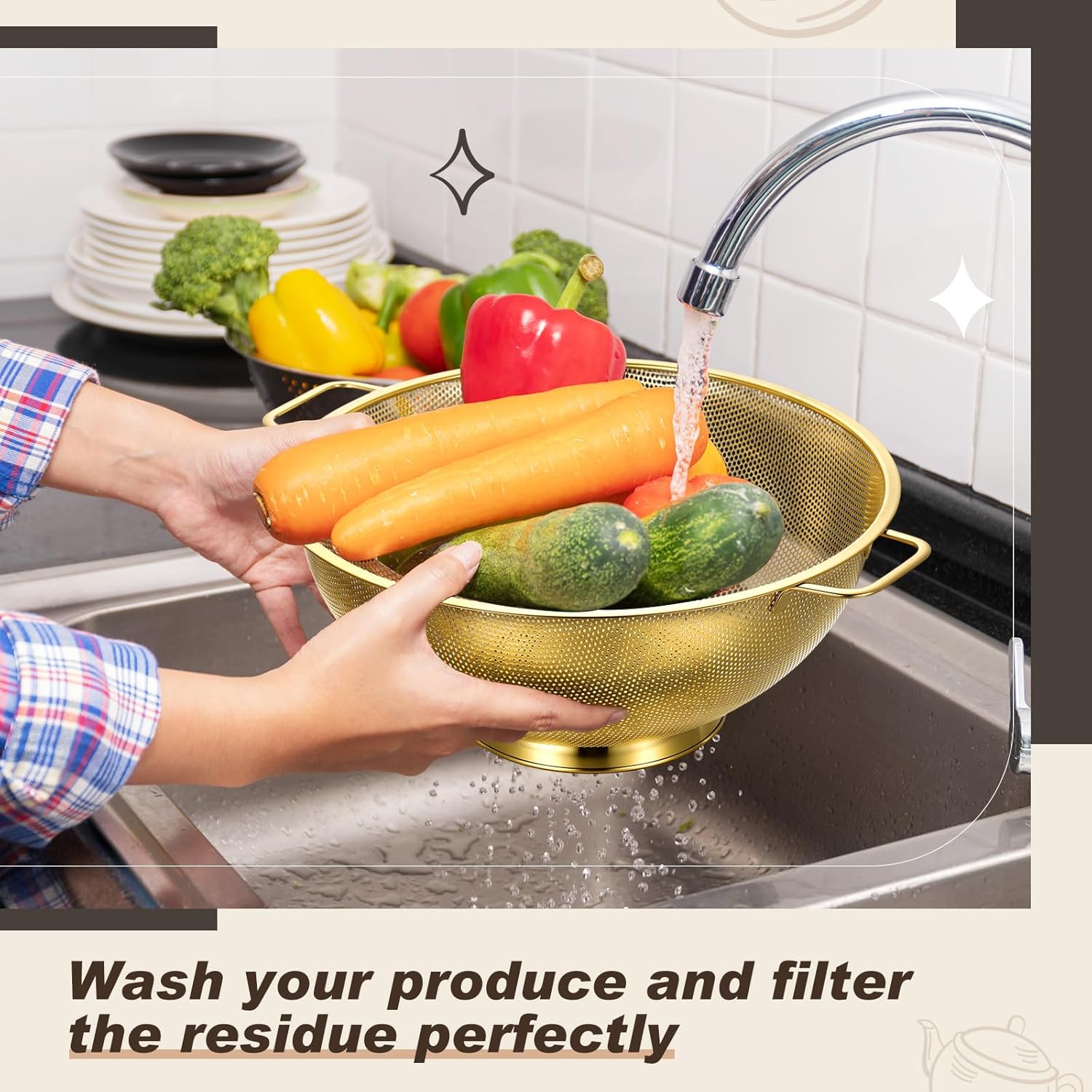 Norme 7 Quart Stainless Steel Gold Colander and 3 Pcs Gold Fine Mesh Strainer, Stainless Steel Pasta Rice Food Metal Strainer with Handles, Easy Clean and Dishwasher Safe