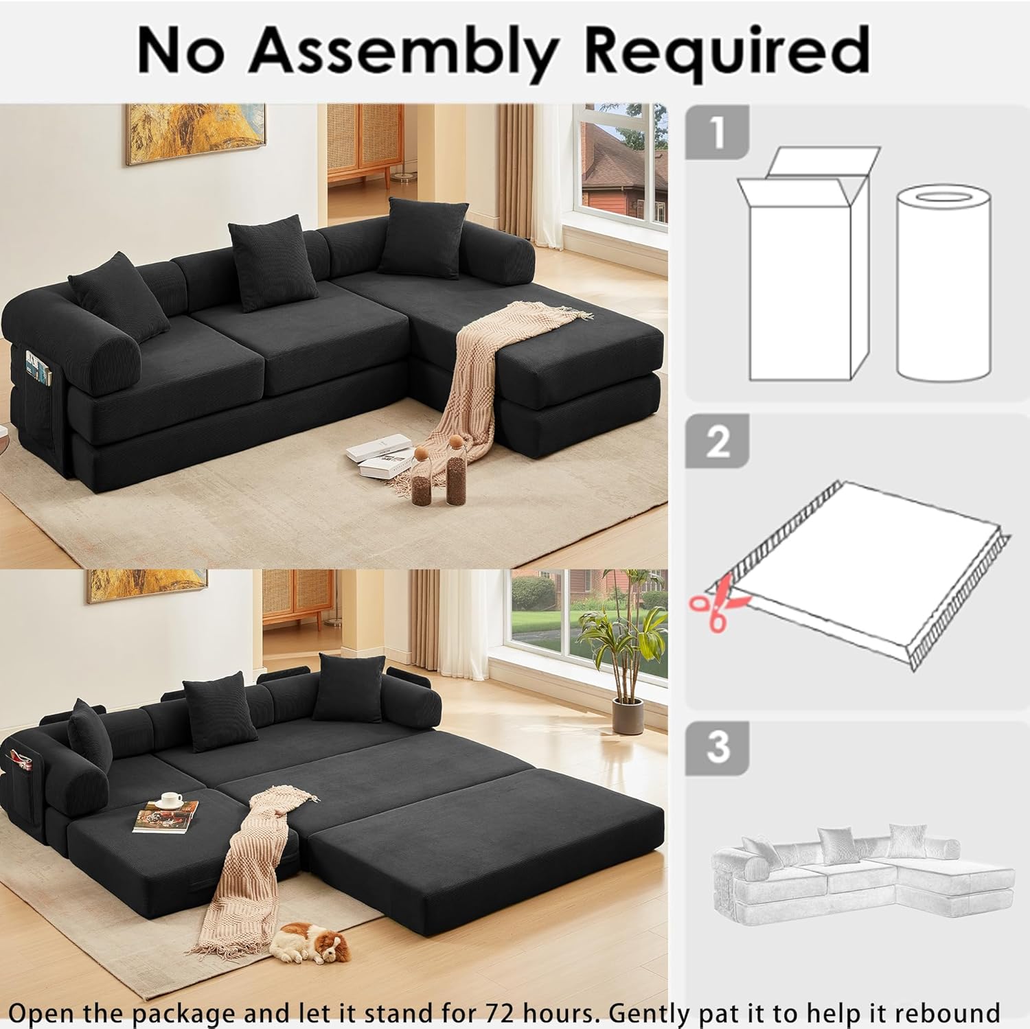 107" Oversized Convertible Sleeper Sofa Bed, Corduroy L Shape Sectional Couch, Folding Sofa Bed with Side Pocket, Modern Cloud Floor Mattress Couch, Modular Sofa for Living Room, Black