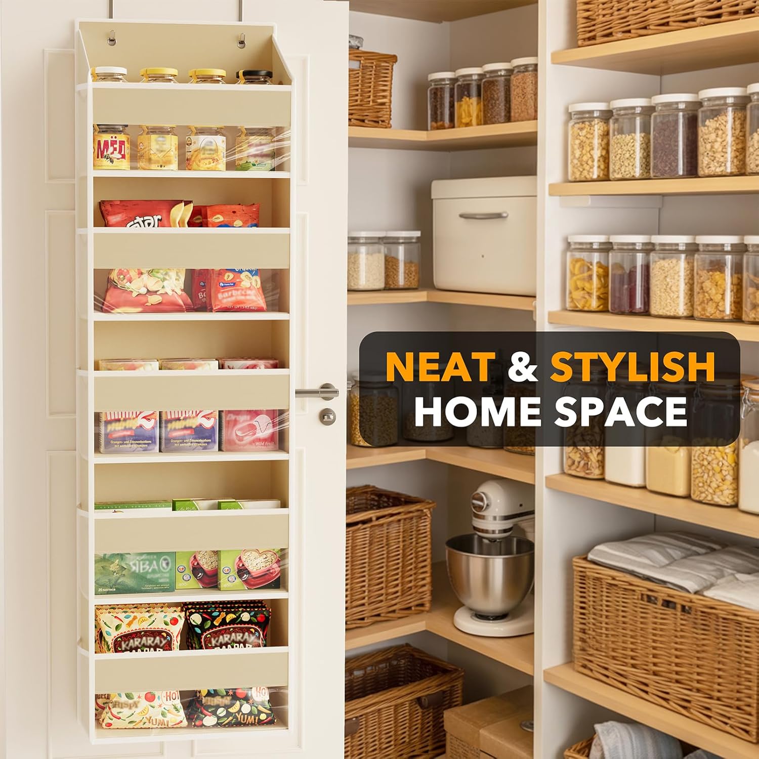 - ORGANIZED AND BEAUTIFUL - Make your behind the door space neat and organized with this 2 pack beige over the door storage and organizer with 5 clear pockets and 10 mesh side pockets; Product Size: 15.2"W x 6.6"D x 55"H