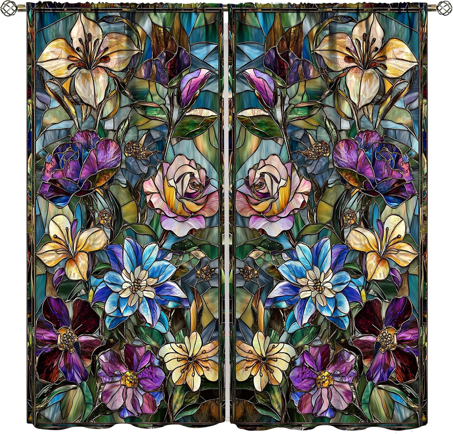 Stained Glass Curtains,Retro Colored Glass Flowers Art Home Decor Drapes for Bedroom Living Room Kitchen Window Treatment 2 Panels Set Total Size 63" W X 72" L Inch