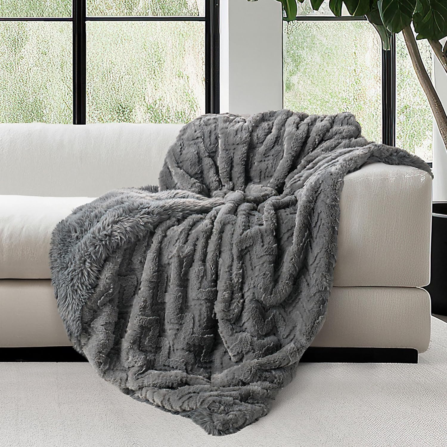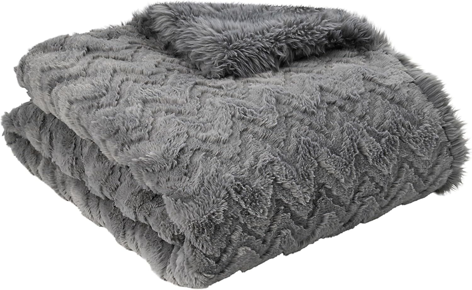 Mon Chateau Grey 3D Jacquard Faux Fur Throw, Plush Luxury Blanket for Couch, Sofa, or Bed, Soft Reversible Throw Blanket for Sleeping, Home & Room Décor, 60" x 70"