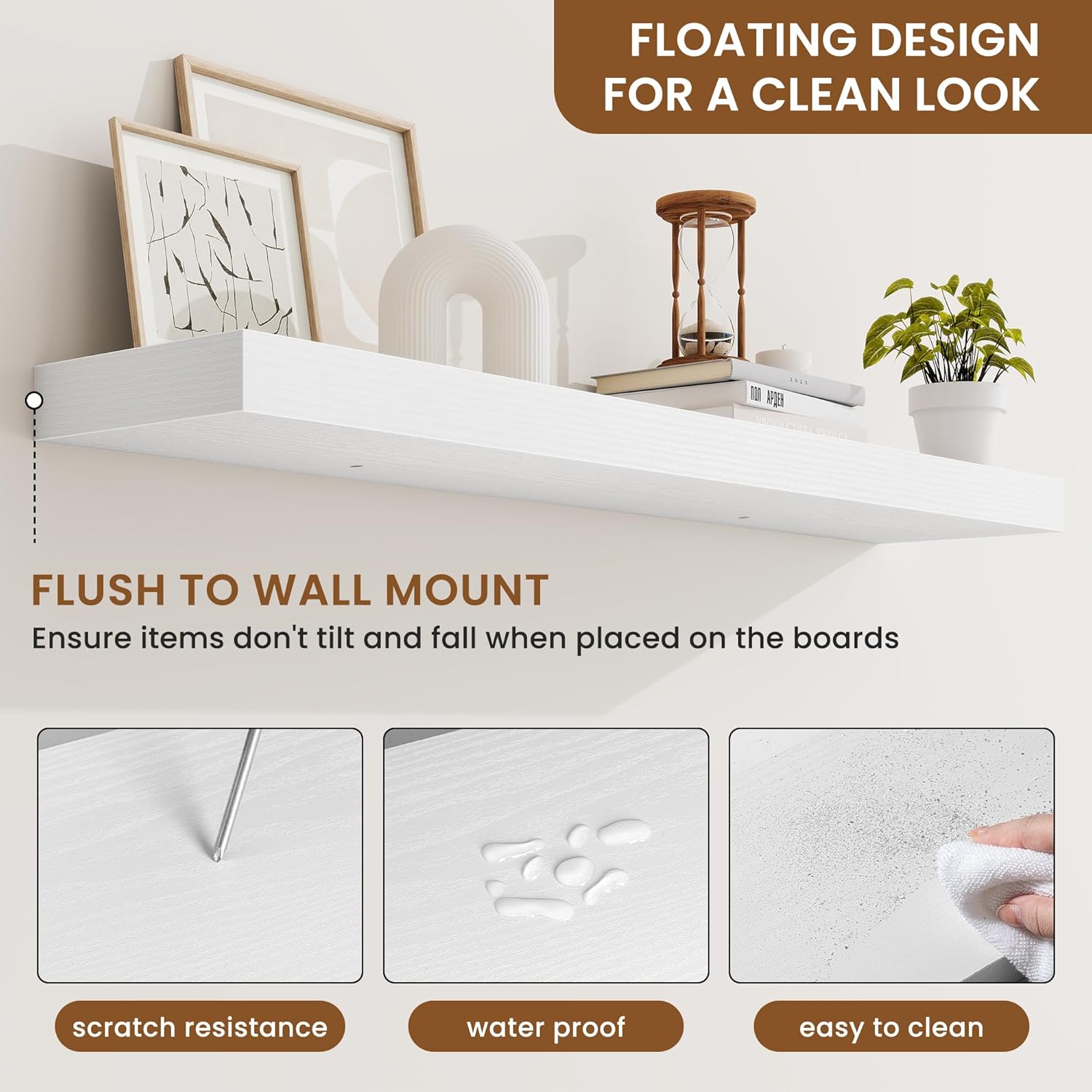 - Well-designed Floating Shelves: Our floating shelves for wall are made of premium engineered wood with a realistic wood grain finish. The rustic wood grain adds warmth and character to any modern or traditional interior. It can organize everyday clutter and make your space tidier, and make it full of aesthetic flare