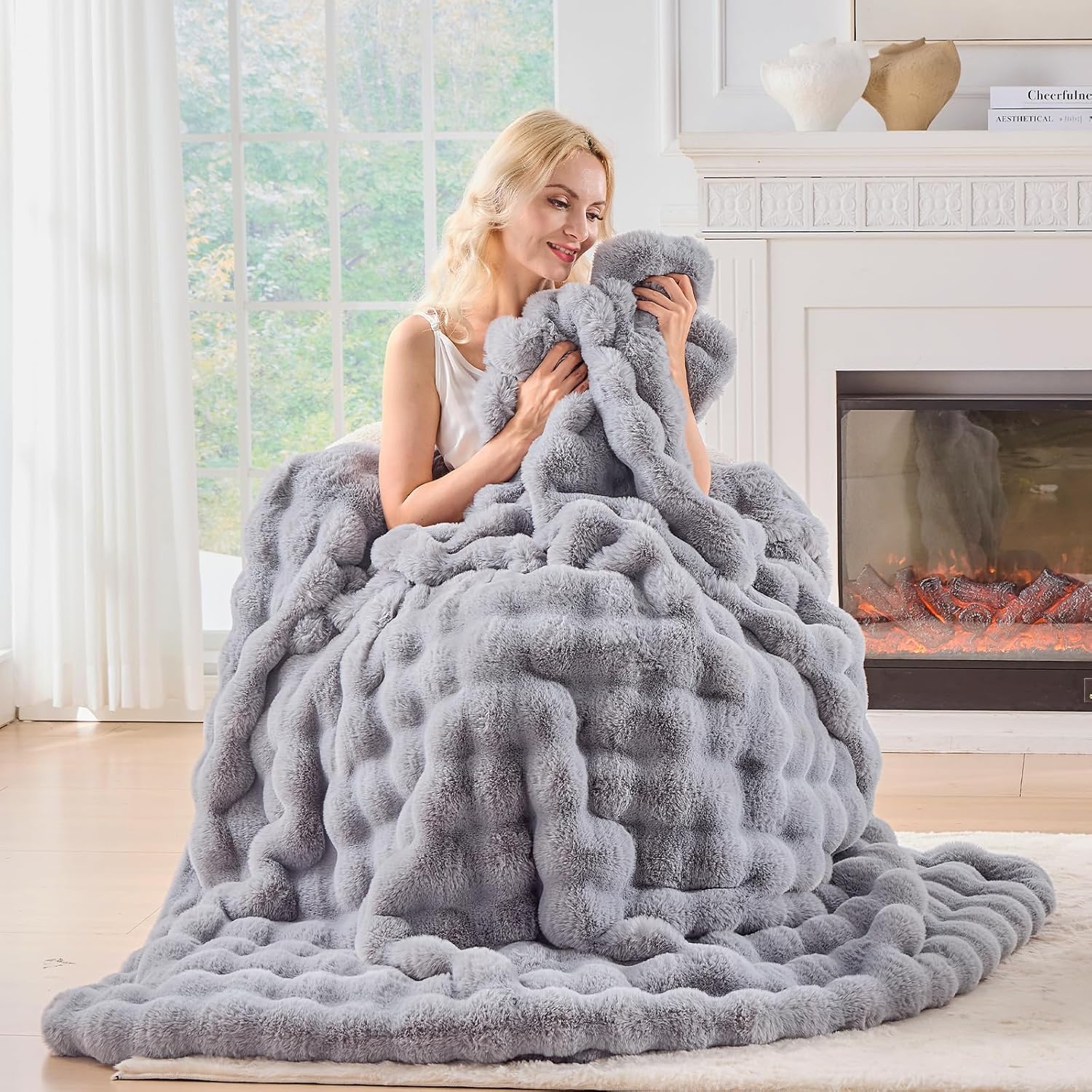 - Luxury Double-Sided Faux Fur: Unlike regular faux fur blankets, ours features double-sided faux rabbit fur. One side showcases a 3D bubble faux fur with a full and dimensional bubble texture, while the other side offers smooth and ultra-soft faux fur. Compared to regular crystal velvet, it's more static-resistant, softer to the touch, and warmer against the skin.