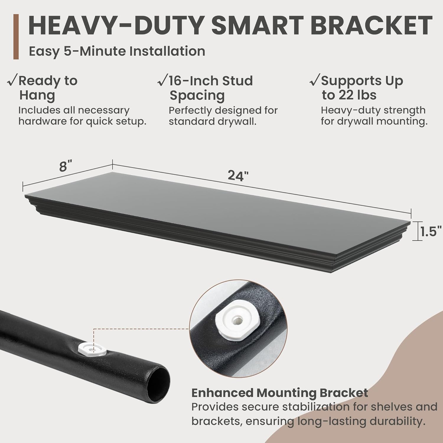- Strong Suppoot: MDF wooden floating shelf with reinforced brackets supports heavy items effortlessly, holding up to 22 pounds. Hanging shelf's bracket has been preset with a 2Β° elevation to remain level and not sag after bearing heavy loads