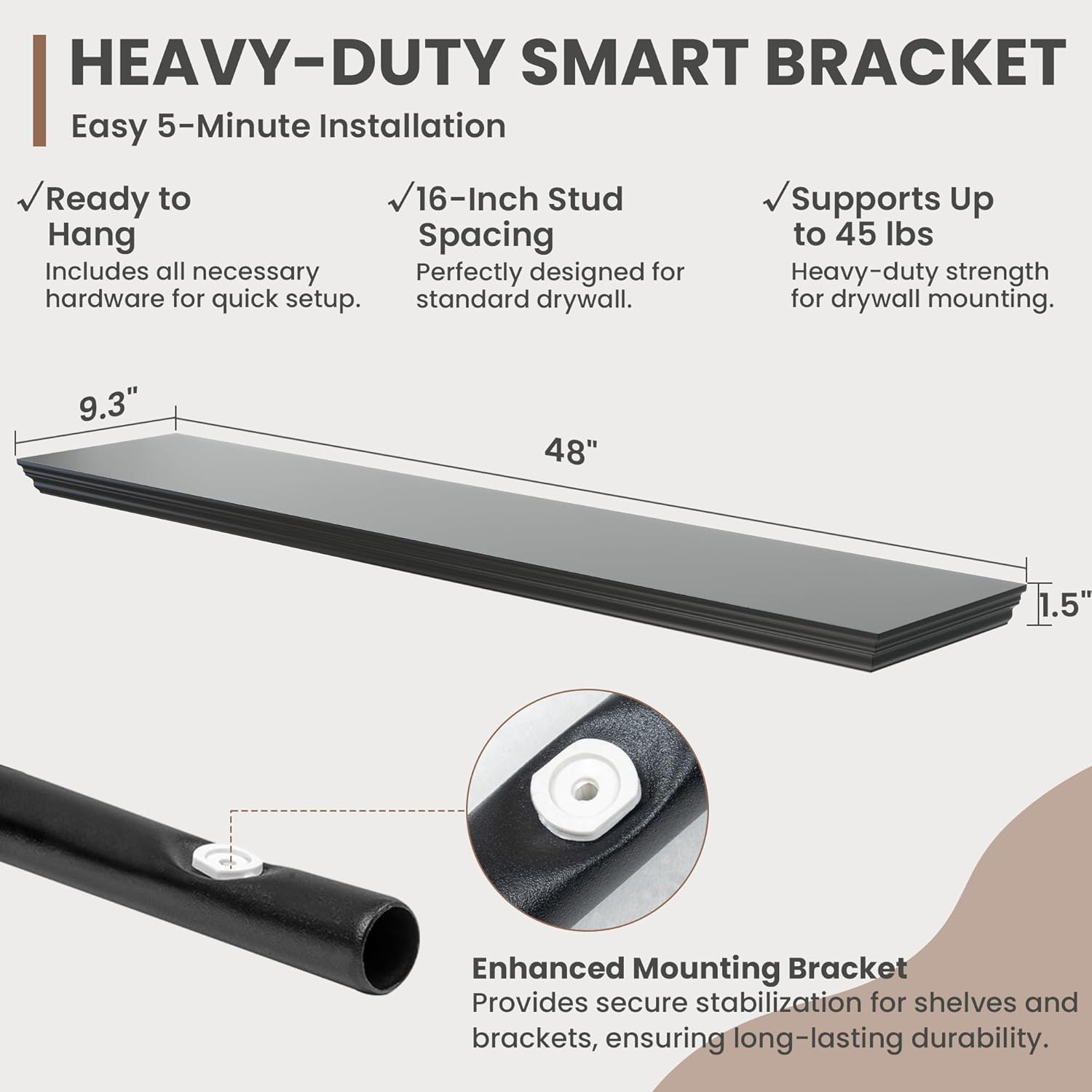 - Package Contents: 1 black floating shelf included, board dimension: 47.3"Wide x 9.3" Deep x 1.5" Height. Other accessories: 1 metal brackets, 1 magnetic level, 3 wood iron connection screws, 9 wall screws and expansion tubes, and 1 installation manual