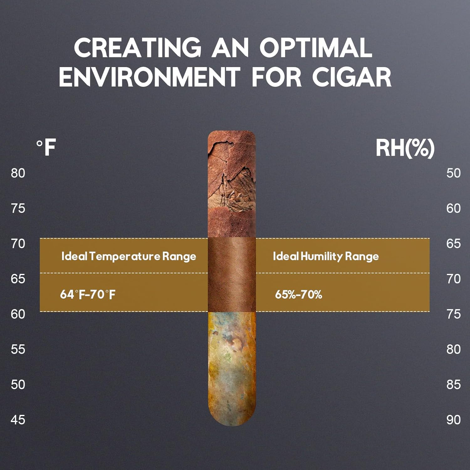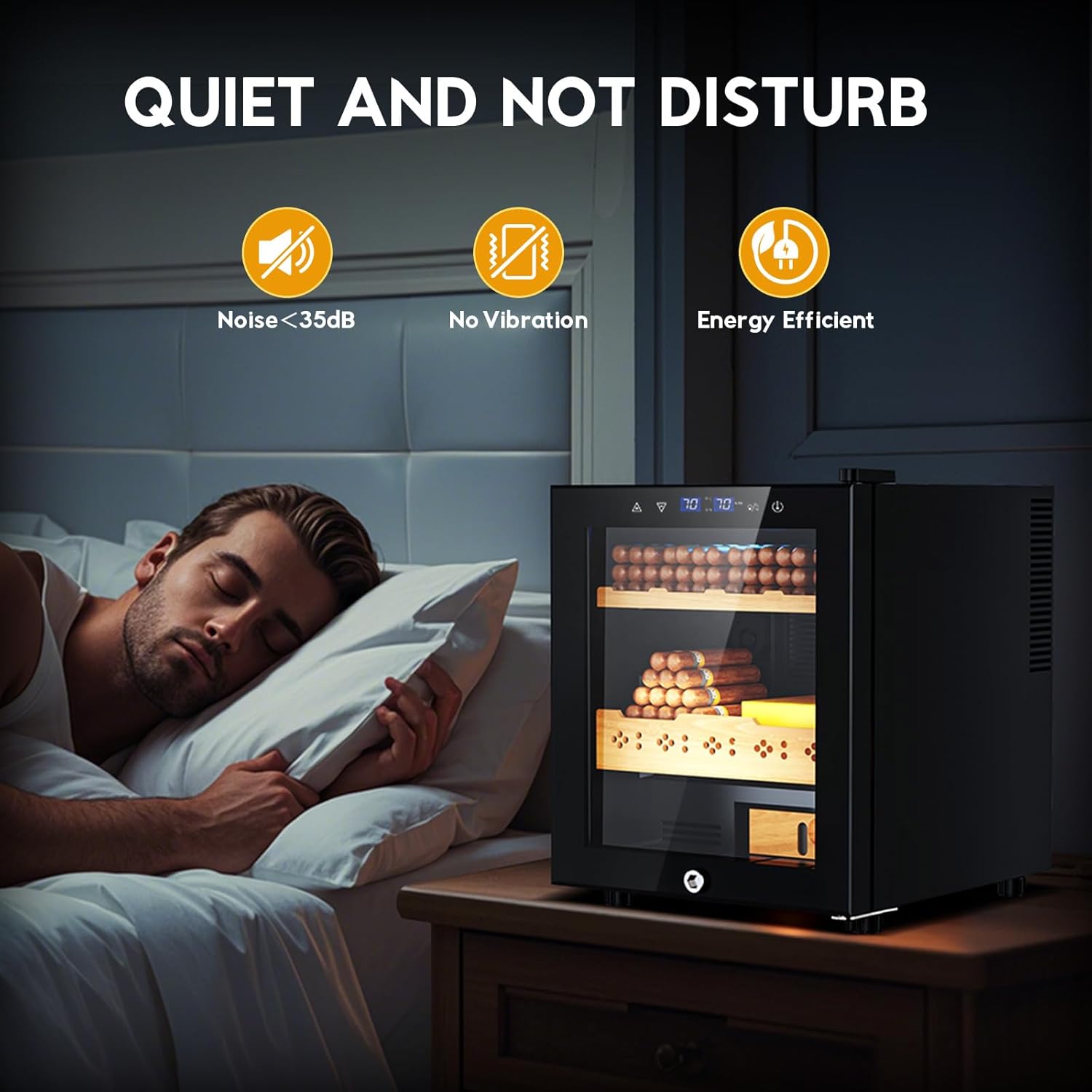 - 【370 Cigar Capacity & Safety Lock】This electric humidors for cigars has a large capacity of 50L, which can hold up to 370 cigars (depending on the cigar ring gauge size). Runs noise < 35dB and no vibration, allowing you to enjoy life with peace of mind. Equipped with a safety lock to ensure the safety of your precious collection. Whether for home or business, it fits perfectly with your home style and is suitable for your living room, study, bedroom, wine cellar, or office.