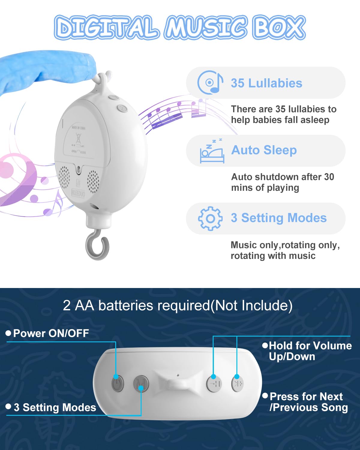- 【35 Soothing Lullabies & Adjustable Volume】This baby crib mobile plays 35 gentle lullabies , with adjustable volume for customized comfort. Perfect for nursery rooms needing versatile sound options.