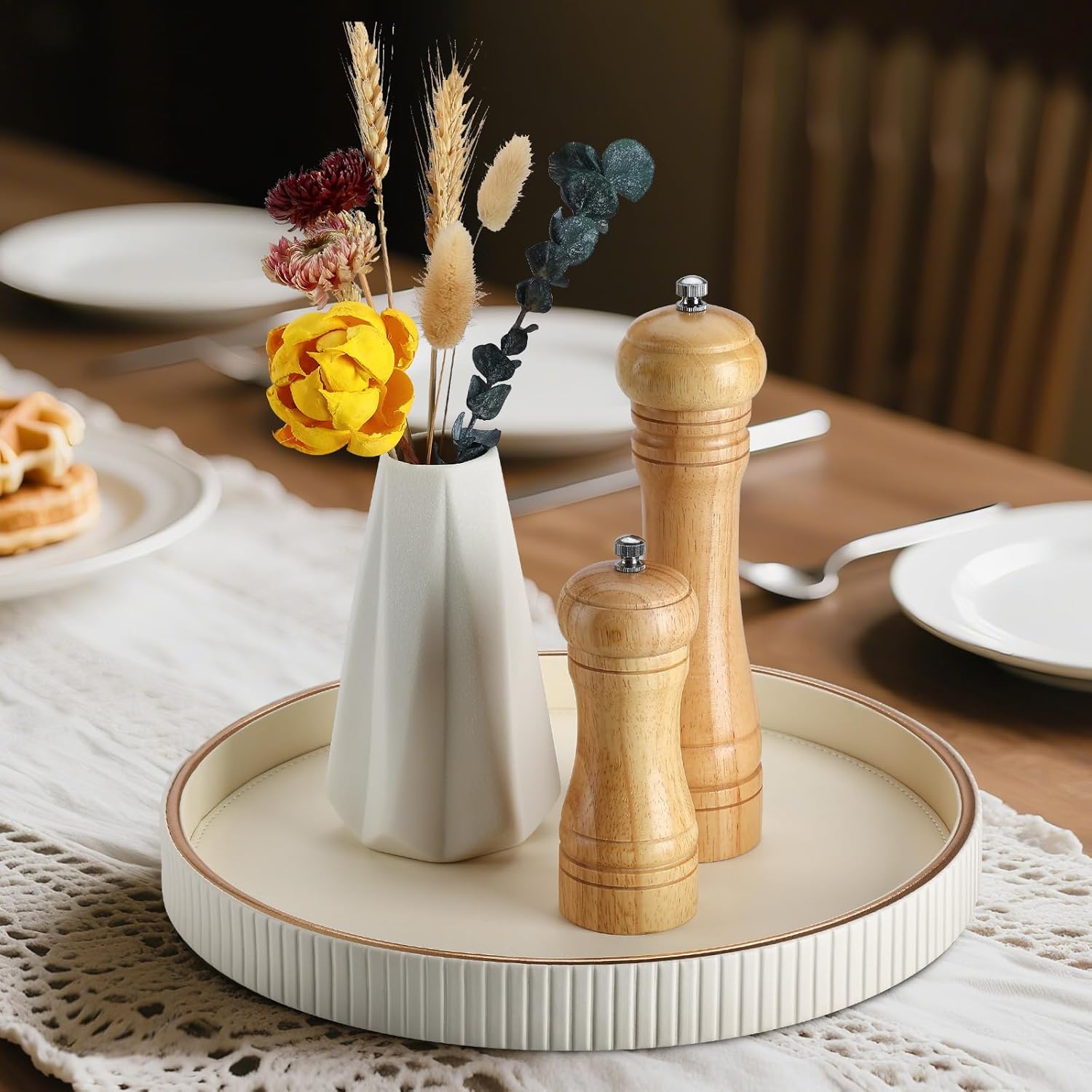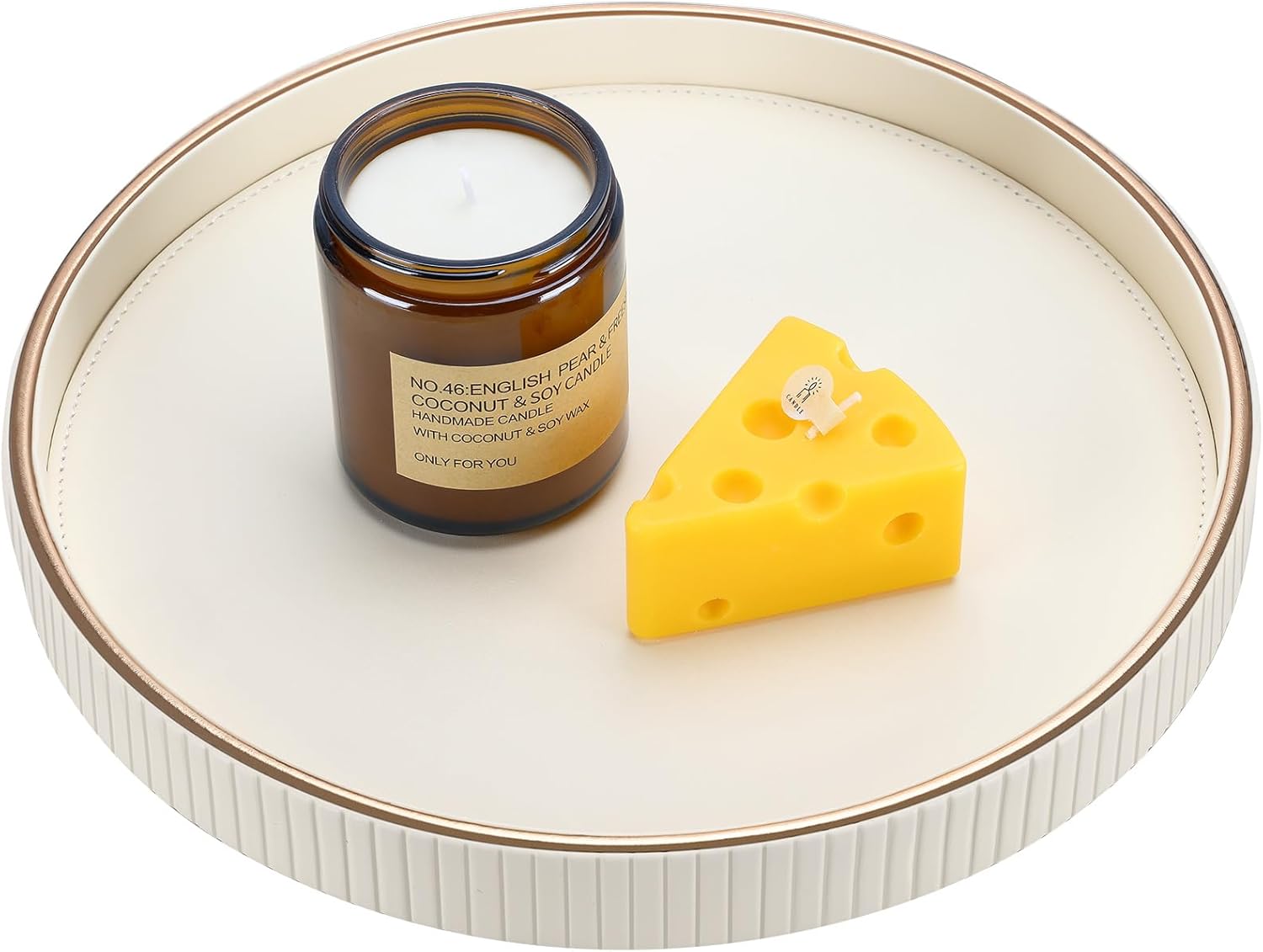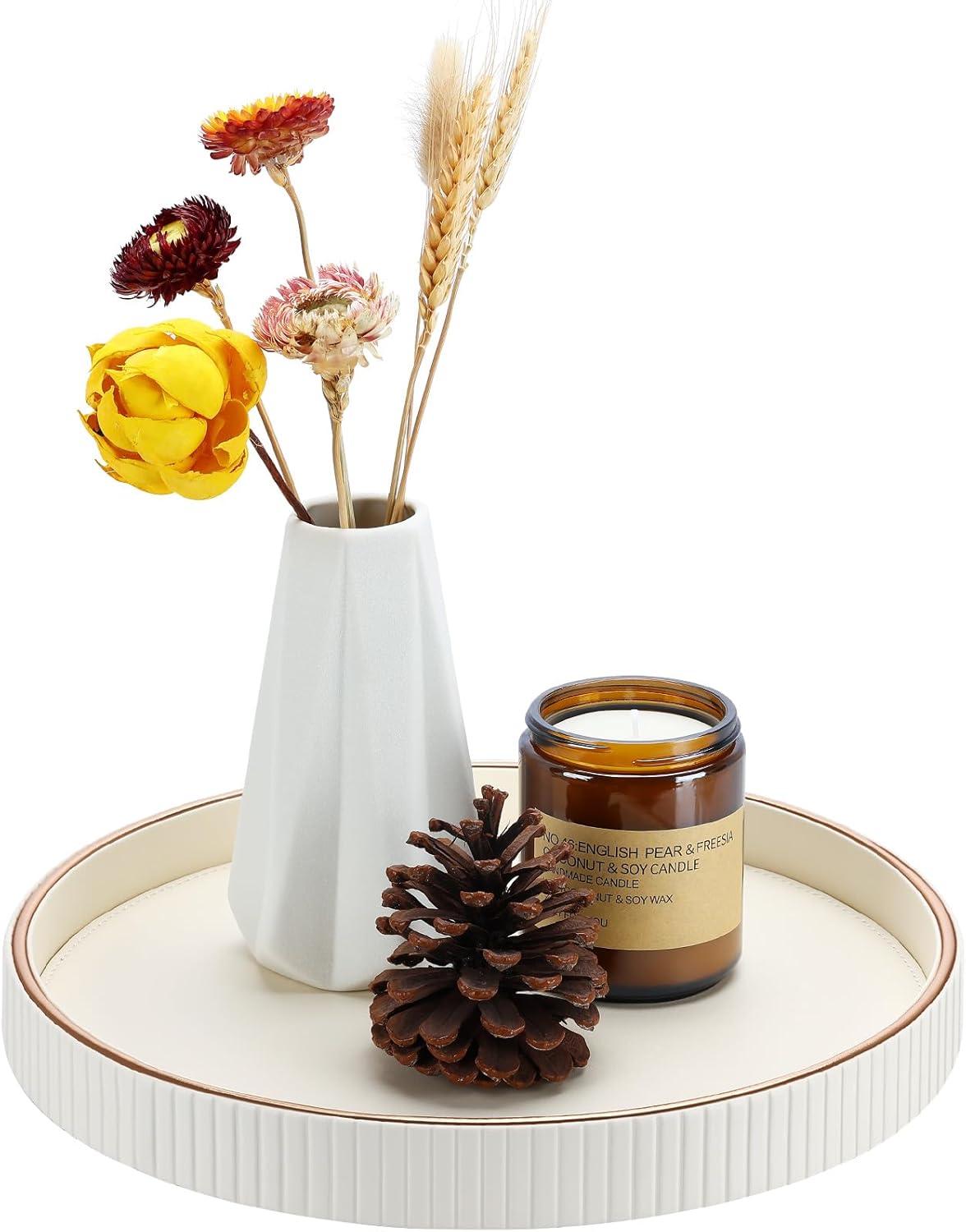 KINGFOM Decorative Serving Tray, PU Leather Valet Nightstand Desk Organizer for Men Women, Round Tray Decor for Coffee Table/Home Decor, Modern Decorative, Centerpiece (Ivory White)