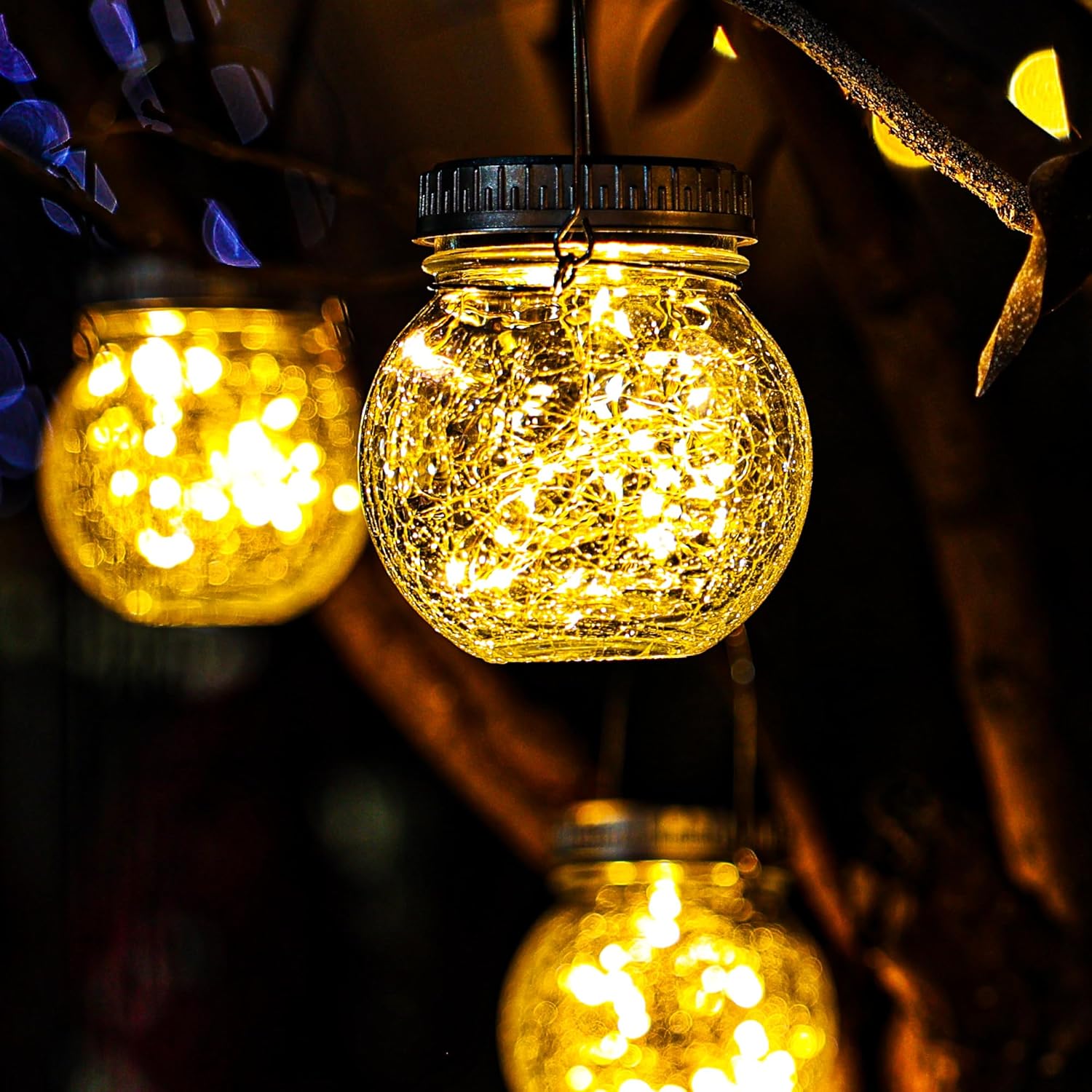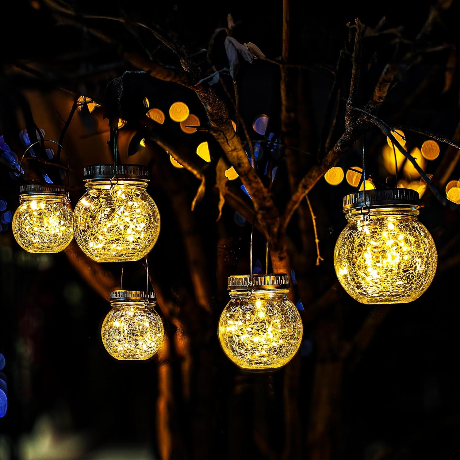 Cooo 6 Pack Crackle Glass Solar Lantern with 30 LED Firefly Lights– Waterproof Outdoor Hanging Lamp 215% Larger Solar Panel, Anti-Rust Lids Decorative Lighting for Garden Patio Table