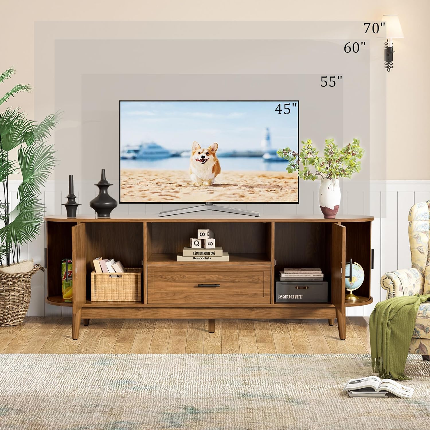 - Elegant TV stand: This mid-century modern style TV stand features curved sliding doors and arched doors, decorated with grooved vertical stripes and metal black handles. The unique design style adds a touch of elegance to the living room or bedroom. It is easy to operate, and the curved design is safer, reducing the risk of accidental collisions, making it an ideal furniture choice for improving the happiness index of the home