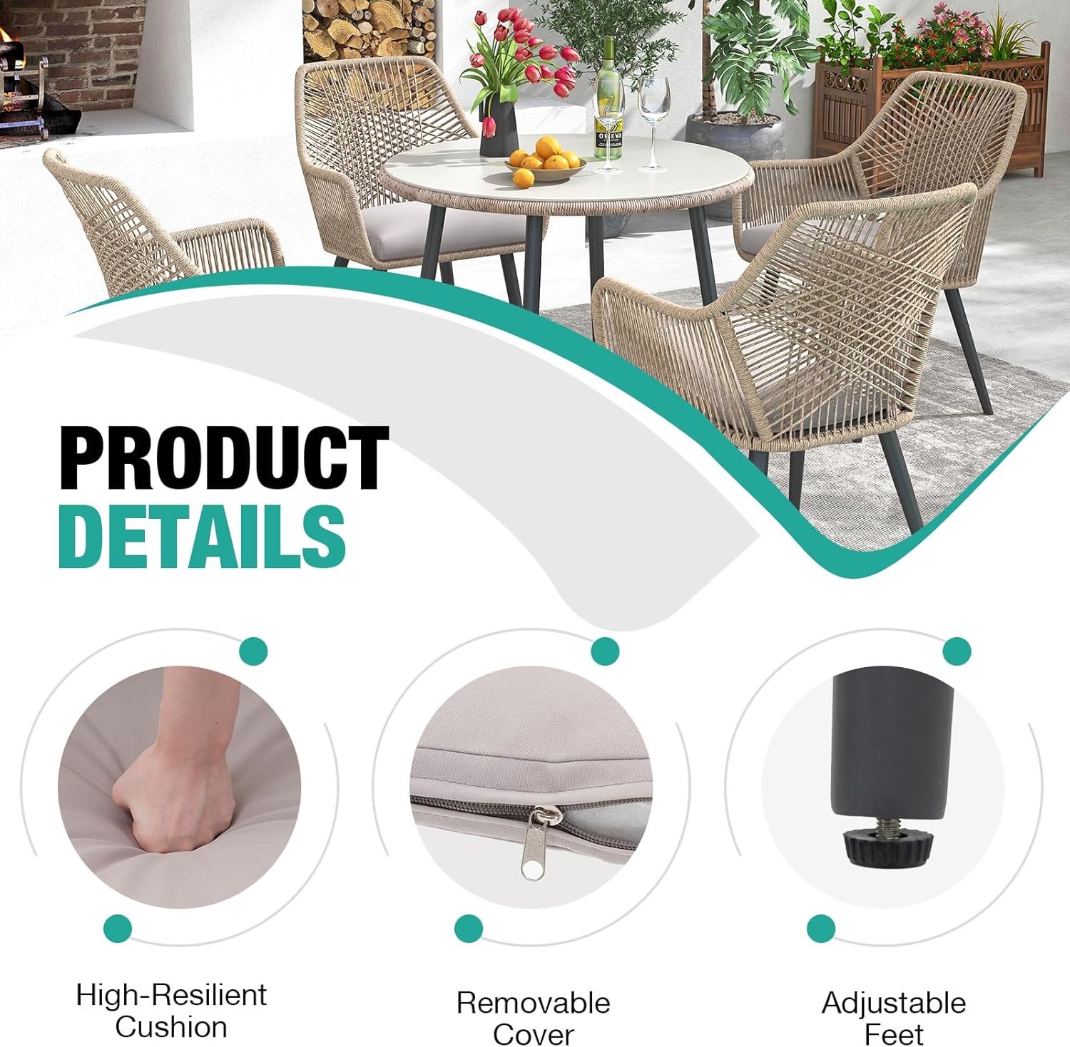- ๐ดใHigh Resilience Cushion With Zipper ใ: Seat cushions are soft and elastic to the touch, giving you a cloud-like comfortable sitting feeling. The polyester fabric cushion covers have zippers for easy removal and cleaning to keep the chairs tidy.
