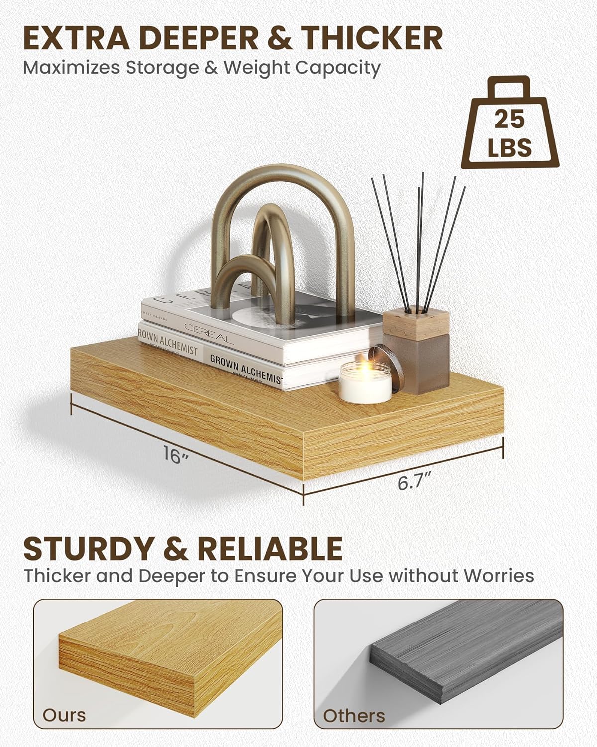- Sturdy & Reliable: Robust construction floating shelves for wall supports everyday items (books, decor, bathroom essentials, kitchen spices) with stability, combining practicality with timeless style