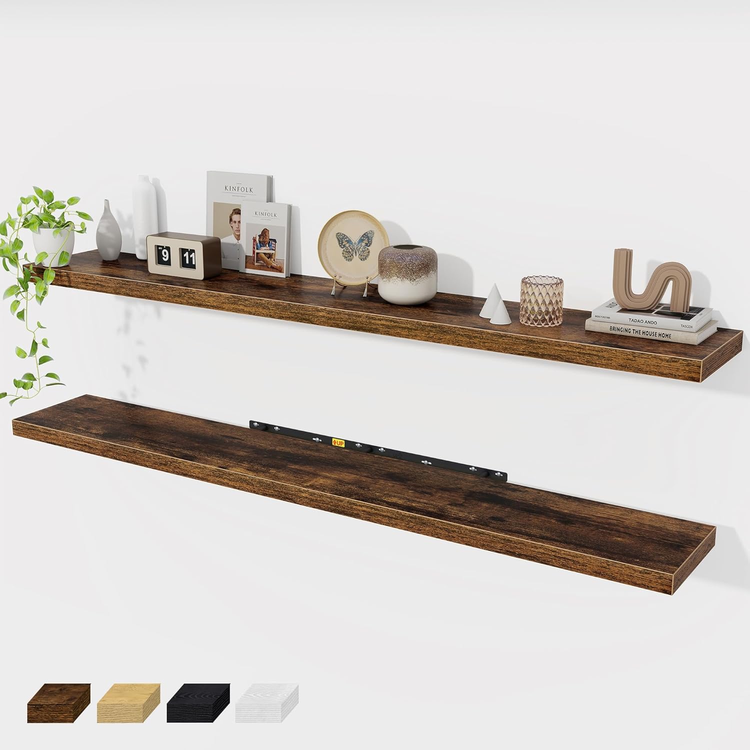Fun Memories 72 Inch Floating Shelves for Wall 2 Pack Shelves for Bedroom|Kitchen|Bathroom 72 x 9.3 Inch Wood Floating Shelf with Invisible Brackets for Books|Storage|Decor, Rustic Brown