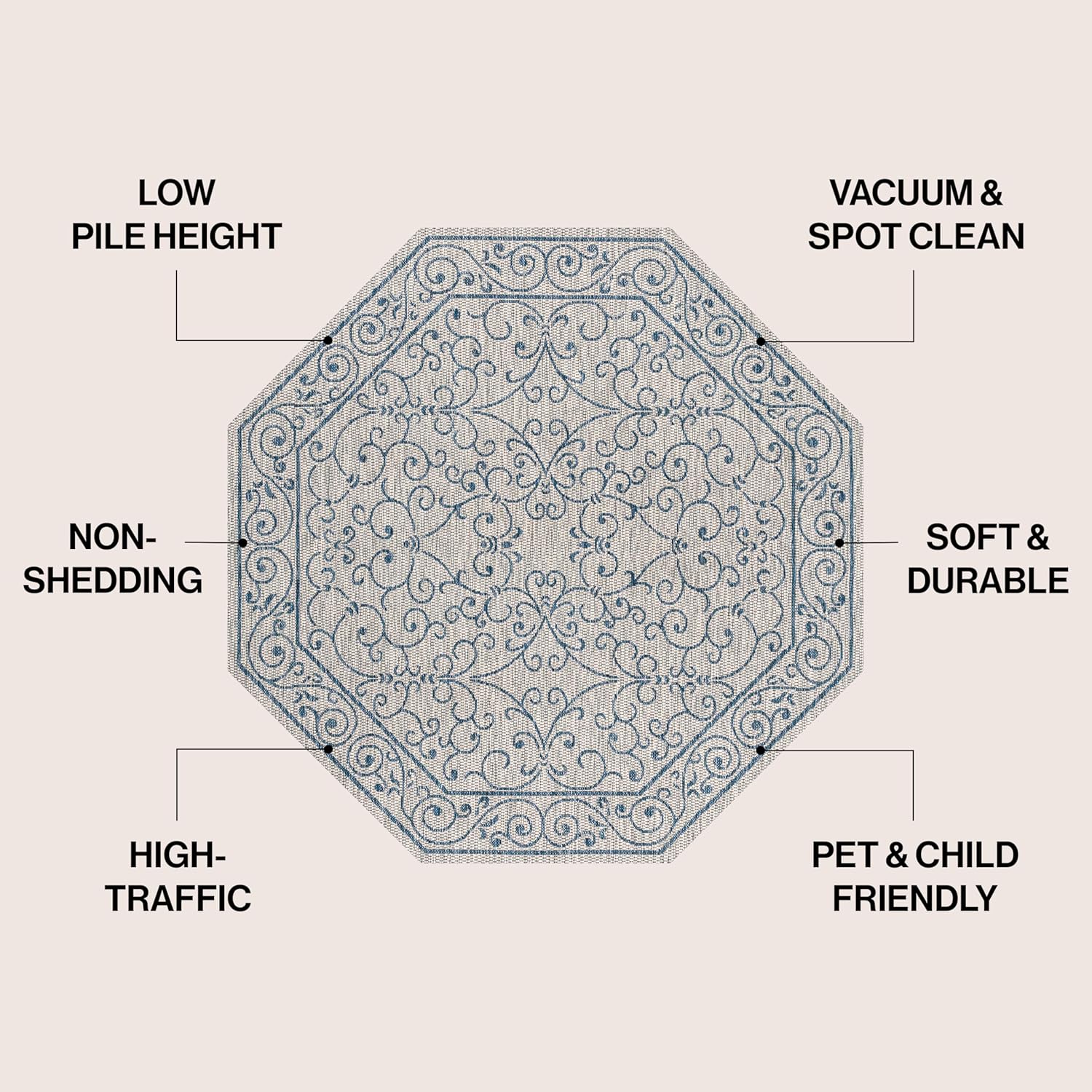 JONATHAN Y Vintage Filigree Indoor Outdoor Octagon Area Rug 8 Ft Gray/Navy, Charleston Textured Weave for Backyard, Patio, Porch, Easy-Cleaning, High Traffic, Pet-Friendly, Non-Shedding SMB106C-8TGN