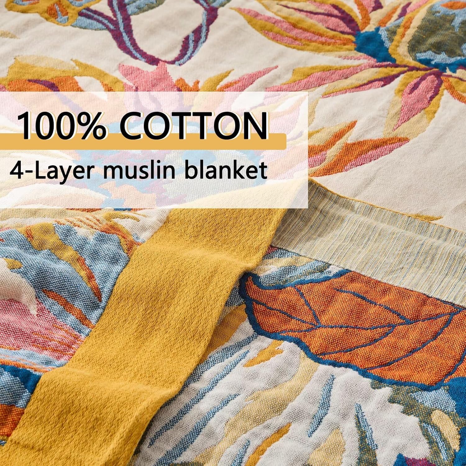 100% Cotton Boho Throw Blanket, King Size Living Room Reversible Fall Throw Blanket, Boho Floral Bird Colorful Retro Quilt Ultra Soft Reversible Gauze Blanket for All Season, 90"x98"