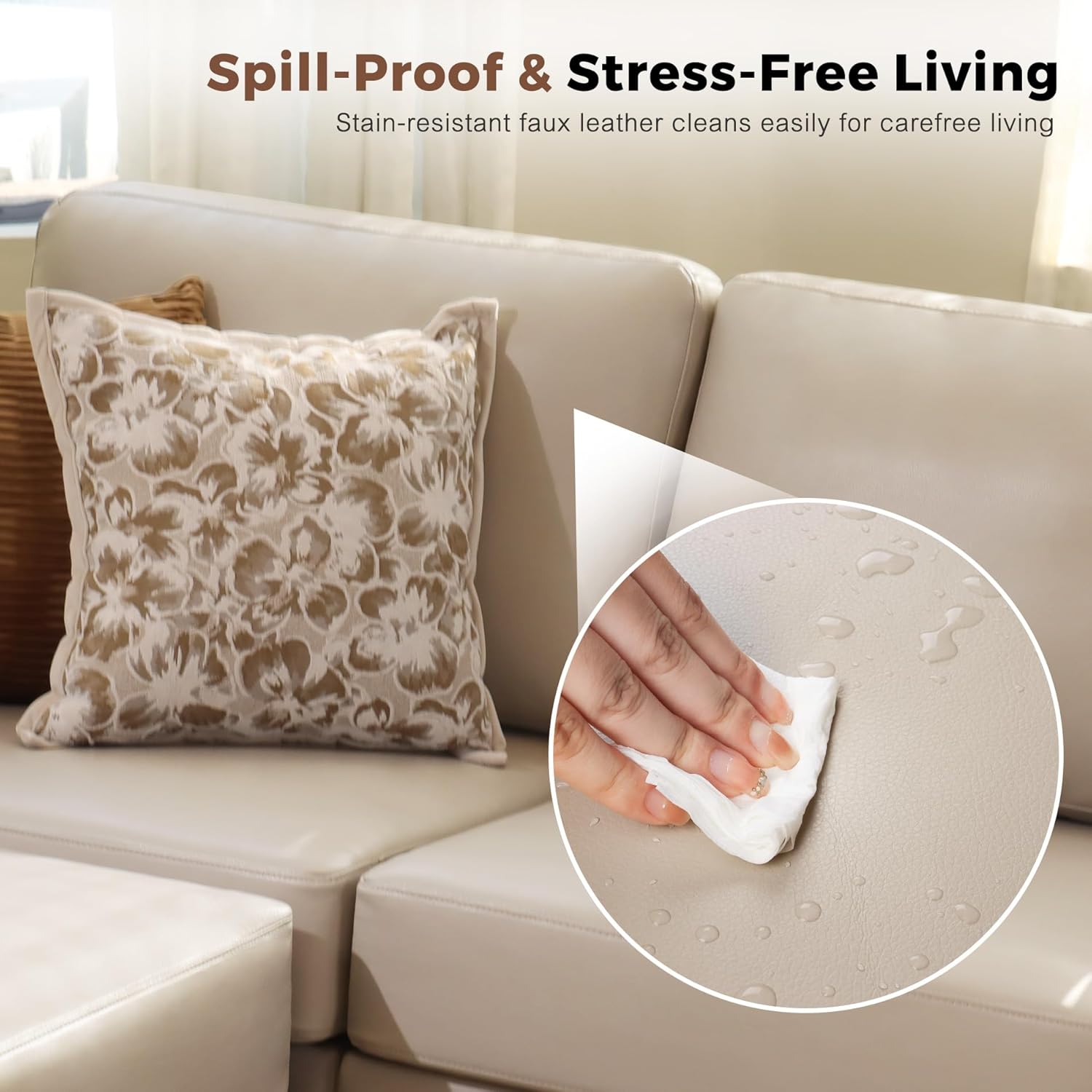 - 💡Effortless-Clean Faux Leather Sofa: Waterproof and stain-resistant faux leather stays spotless. Wipe spills clean in 10 seconds with a damp cloth. The scratch-resistant textured surface feels soft and smooth, maintaining a stylish look even with pets and kids.
