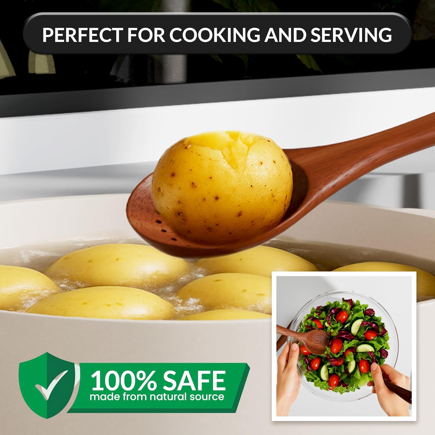 - [Complete 6-Piece Wooden Utensil Set] Includes spatulas, spoons, strainer, and salad fork — essential wooden kitchen tools for stirring, flipping, mixing, and serving.