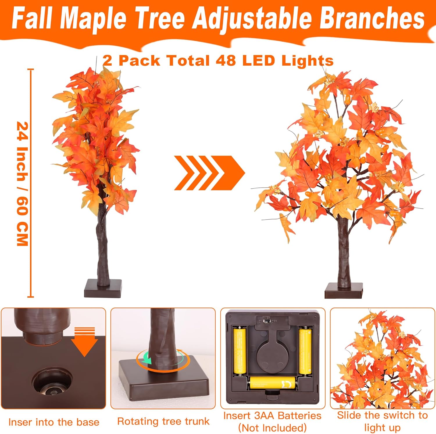 - [ Light Up Fall Maple Tree ]: You will receive 2 Pack lighted maple tree. Each 24 inch tall maple tree light is embellished with 24 LED bulbs, designed with 12 maple leaf lampshades, 12 acorn lampshades and 48 maple leaf, the color of the maple leaves range from vibrant orange to red. Warm white lights glow making festival ambience for your home fall party