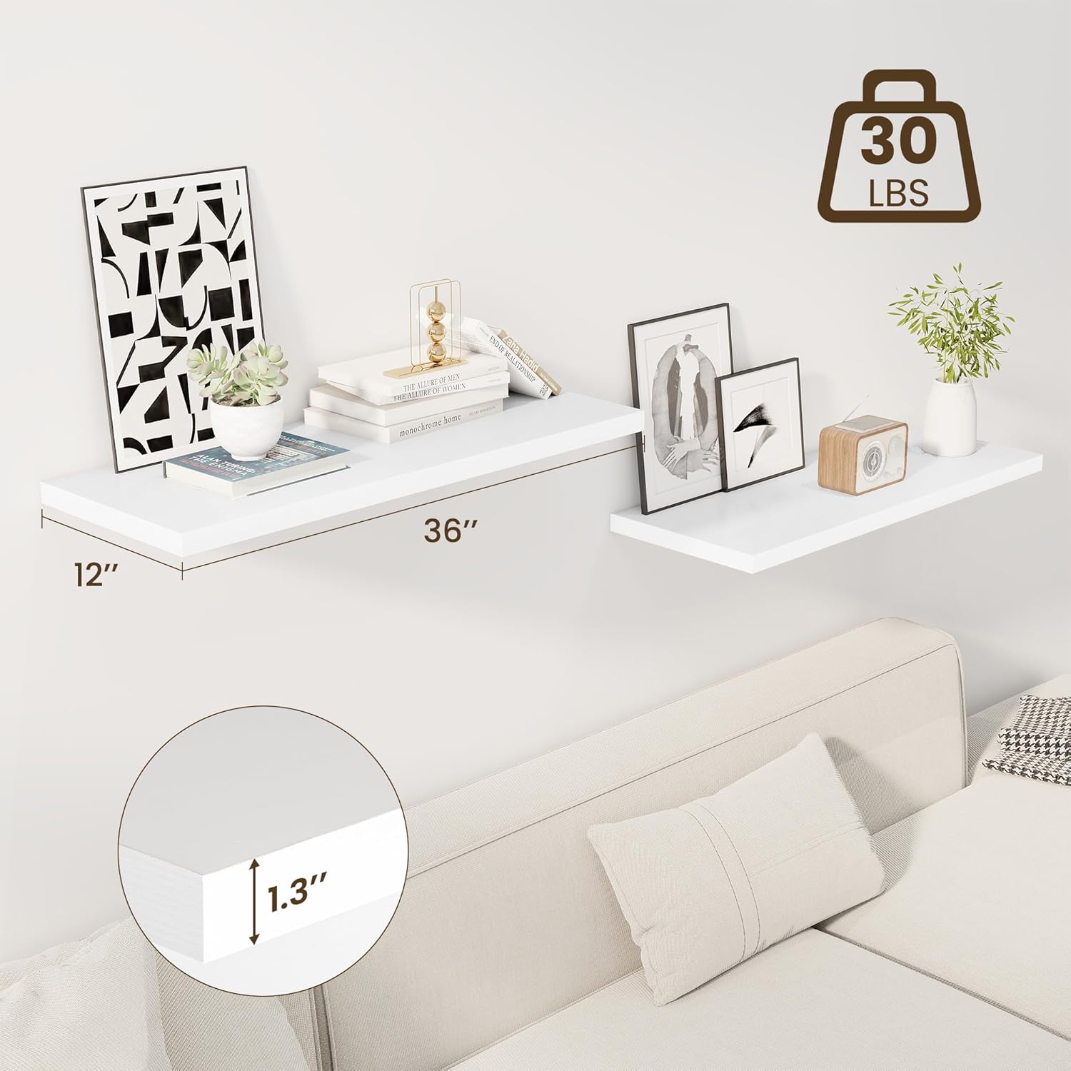 - 12" Deep Floating Shelf: Break the mold with our 12" deep, 1.3" thick floating shelves—perfect for books, frames, trophies, and more. These sleek and space-saving shelves blend storage and style, bringing a clean, modern look to any wall in your home.