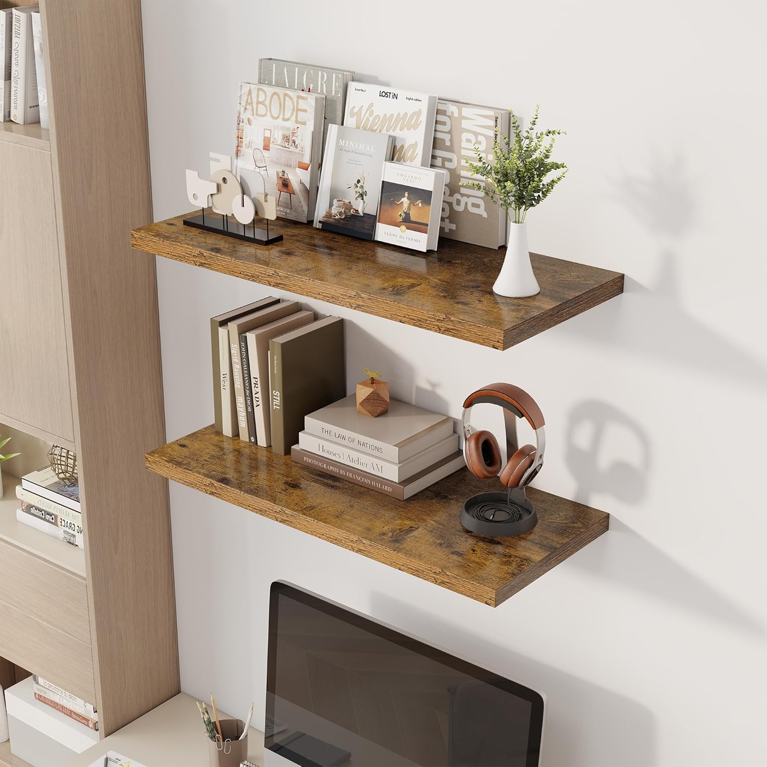 32" Floating Shelves for Wall, 12" Deep Slim Rustic Brown Floating Shelves, Wall-Mounted Shelves for Bedroom, Living Room, Kitchen, Bathroom - Set of 2