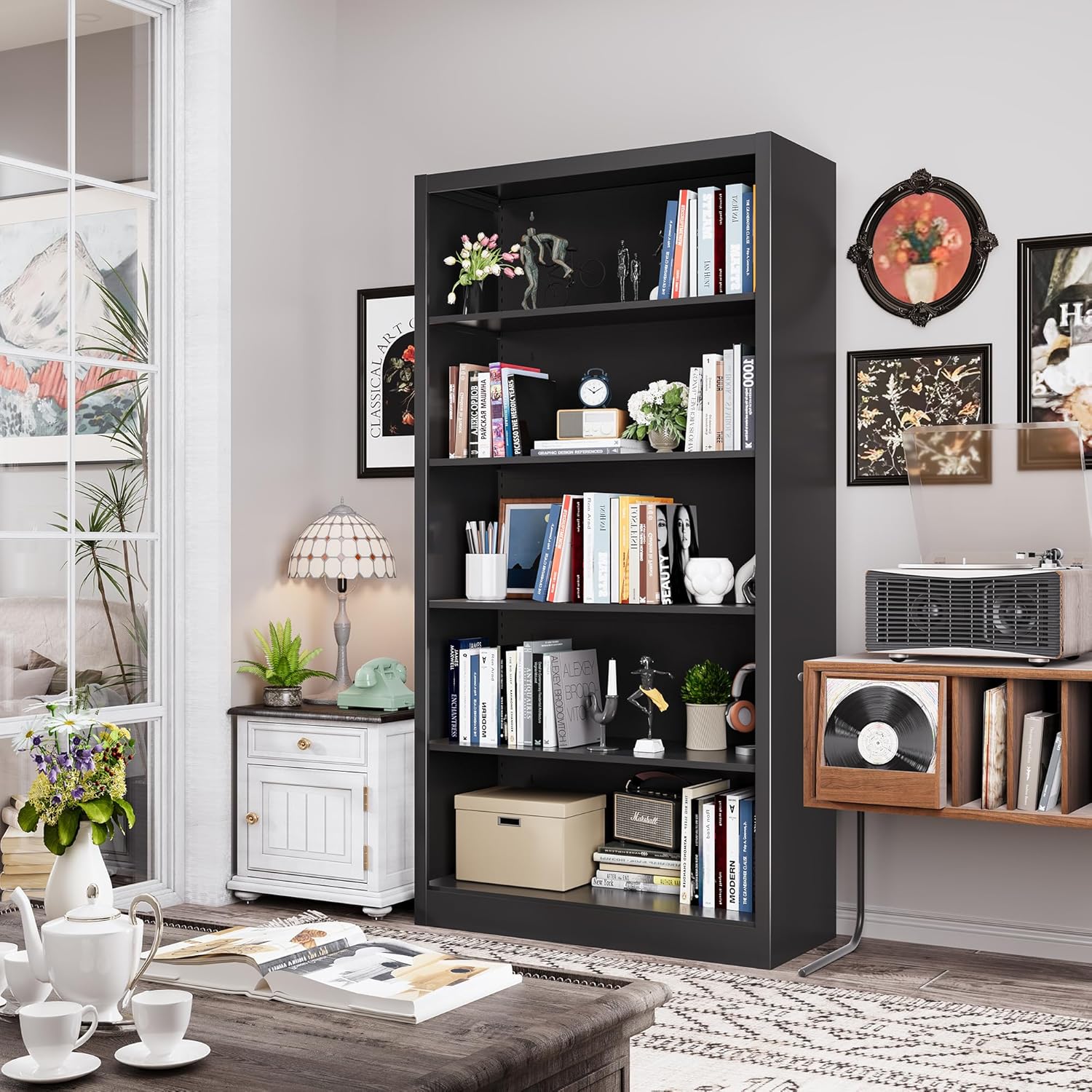 - 【Metal Bookshelves and Bookcases】The tall bookshelf is stable, sturdy, and durable. Each shelf of metal shelf can support up to 180 pounds without sagging or bending over time. More sturdy and durable than wooden bookcases, does not emit formaldehyde, and has a longer lifespan. Adjustable 5 tier bookshelves can change the size and quantity of storage space. You can safely place large items and hand them over to metal shelves.