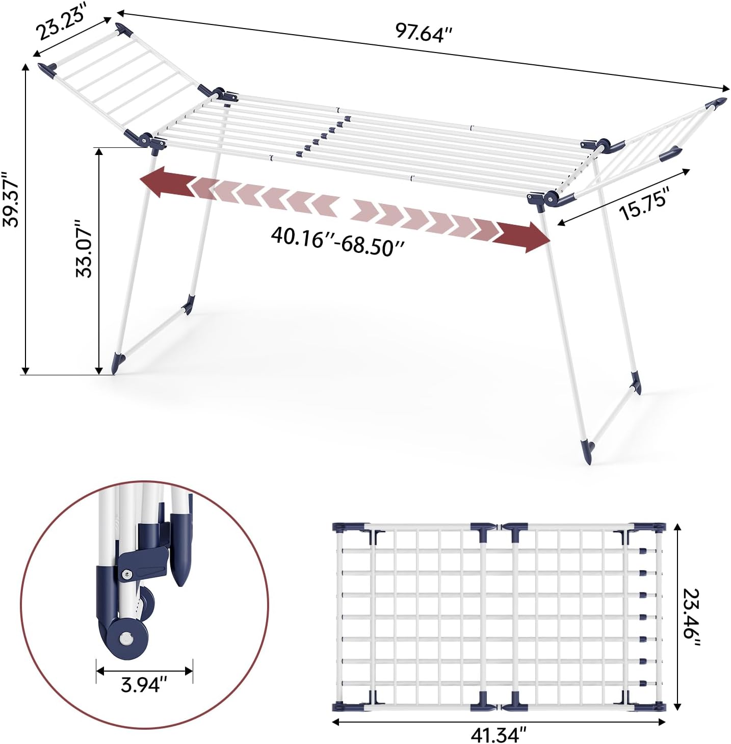 - Large Drying Capacity - The drying space of Apexchaser clothes drying rack is 97.6" X 23.2" X 39.4". The clothes airer has 9 long pipes which can be extended and 12 short pipes which can dry a full load of clothing in one go