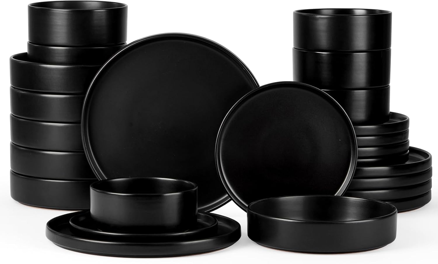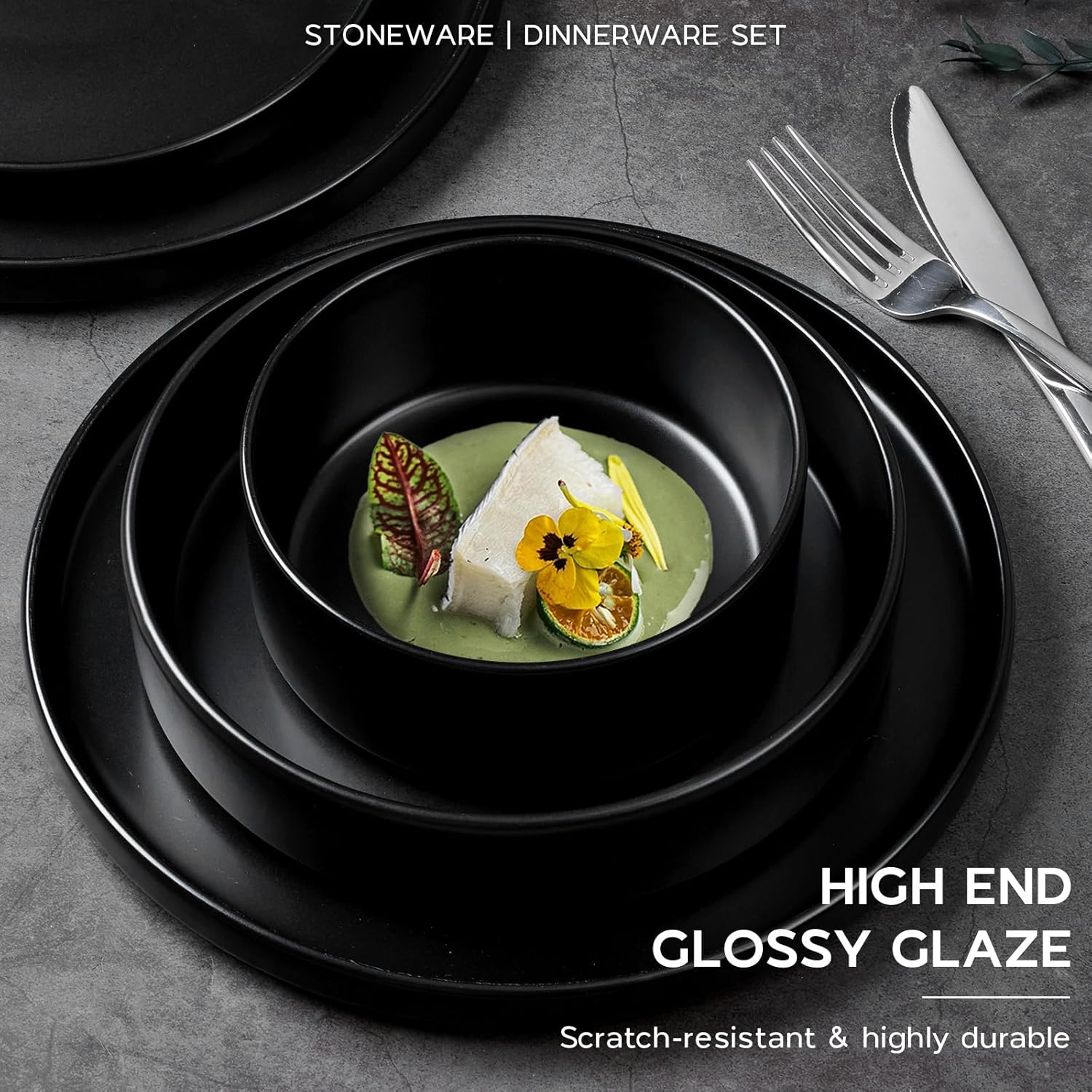 Onader 24 Piece Stoneware Dinnerware Sets with Pasta Bowls, Kitchen Dinner Dishes Set for 6, Plates and Bowls Dishware Dining Ware - Ebony Black