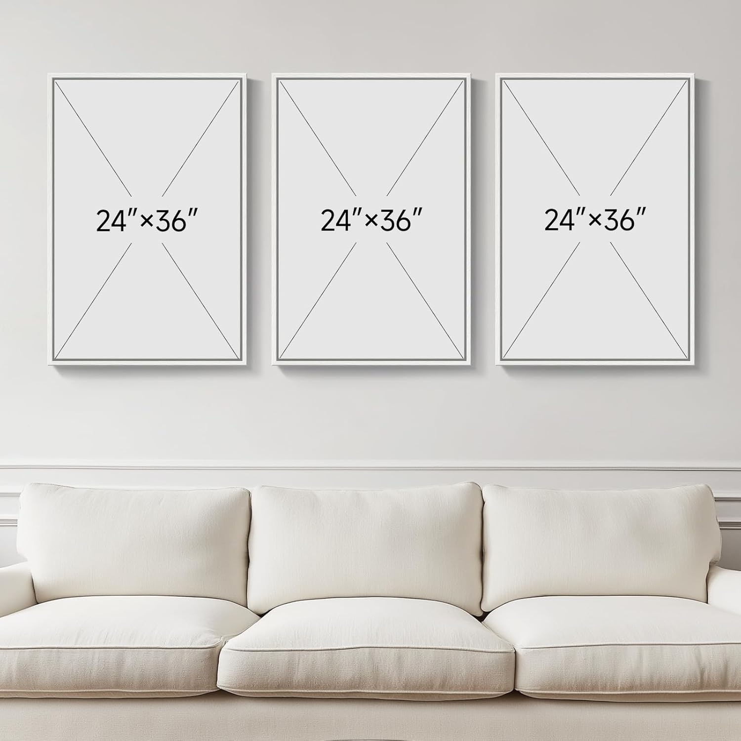 - [Framed Wall Art]: A set of 3 contemporary large framed minimalist green abstract landscape wall art, each with a size of 24" W x 36" H. The total size when the 3 pieces are hung is 36" H x 72" W. Each painting comes with a solid wood white frame