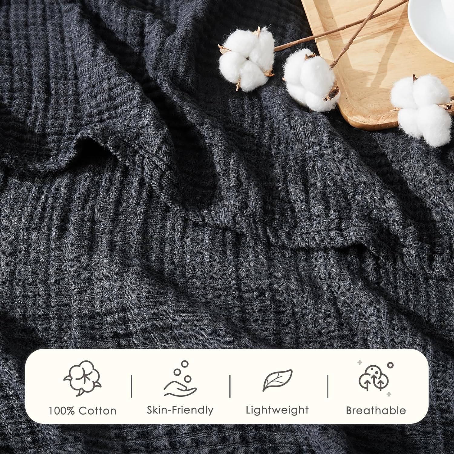EMME Cotton Muslin King Blanket Bed Layering Breathable Gauze Blanket Soft Lightweight Blankets Adults (Black, 108"x90")