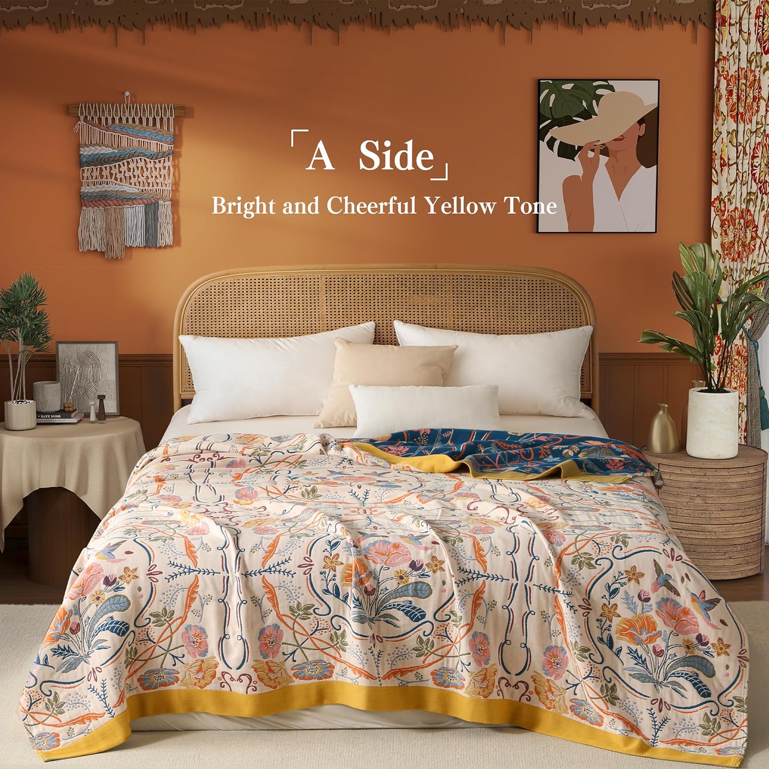 Boho Throw Blanket Twin Size, Soft Cozy Cotton Muslin Quilt Blanket for Bed Decor, Floral Patterned Couch Sofa Chair Cover, Vintage Farmhouse Cottage Tapestry Woven Blanket, Yellow&Blue