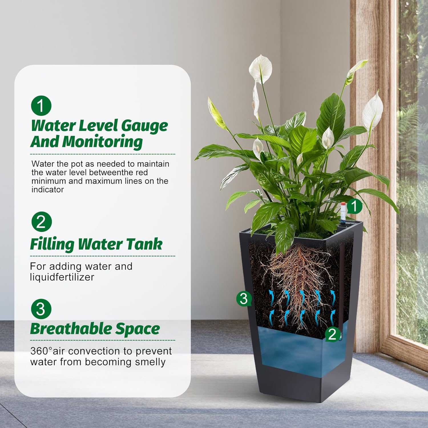 - Automic Watering System: Each tall black planters comes with built-in drainage holes and a sink to ensure that your greenery absorbs water smoothly and minimizes root rot. When the water level is low, the automatic watering system kicks in to provide your plants with the necessary moisture with minimal effort