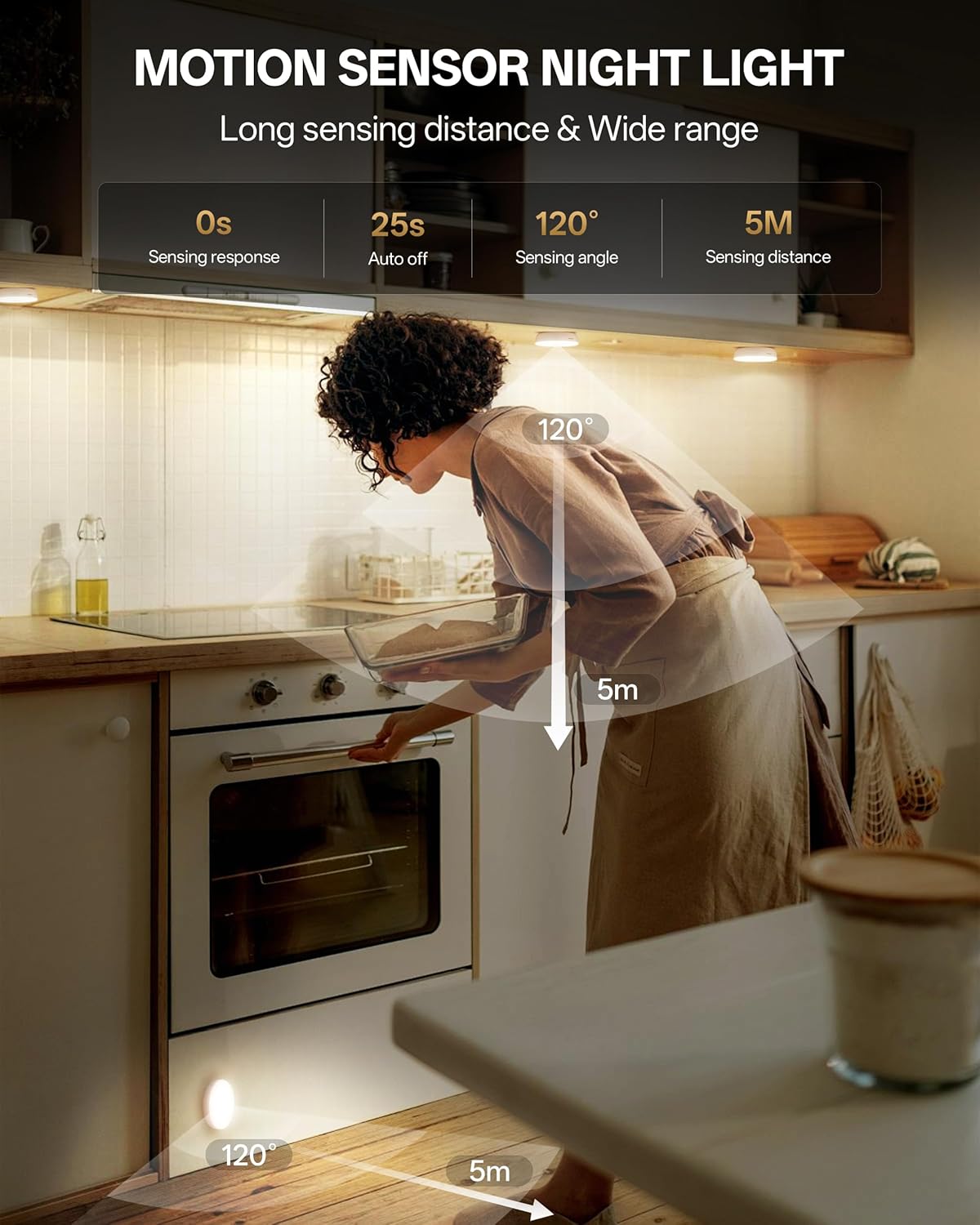 - ใ Motion Sensing & 3 Mode OperationใIndustrial-grade 120ยฐ wide-angle sensor detects movement within 16ft (5m) radius. Customize illumination with: Smart Daylight Mode: Auto-adapts to ambient light - activates all day only when Lux <60. Night Auto Mode: under cabinet lighting wireless only activated in a dark enviroment. Tips: if no motion is detected in 20s after turning on, the motion sensor closet lights will turn off for energy conservation. Always-on Mode-press the "ON" button on remote control in AUTO mode