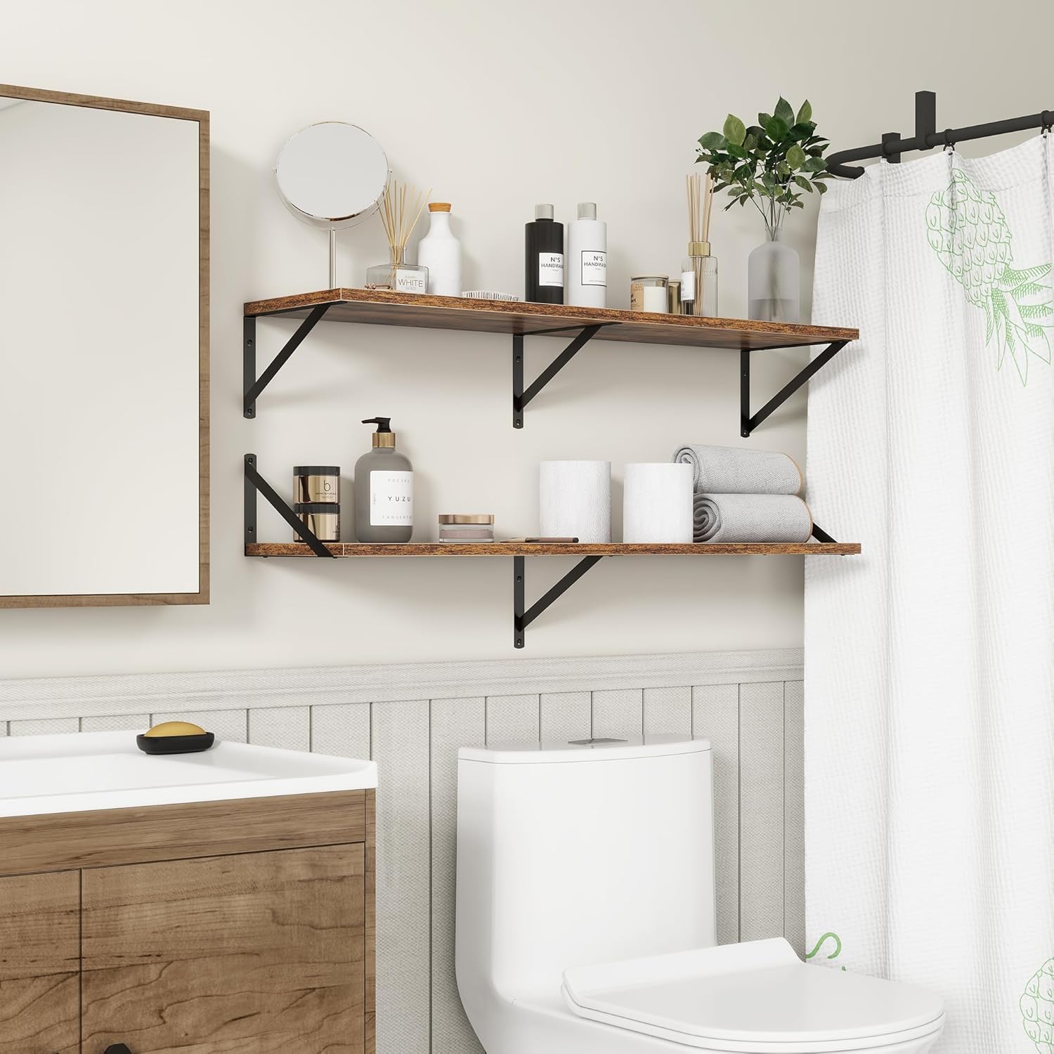 - γFARMHOUSE RUSTIC WALL SHELFγThese floating shelves are made of premium engineered wood board and visible triangular bracket. The rustic wooden grain surface add character and warmth to any modern or traditional interior with these deep floating shelves, contrast shelves at staggering heights on the wall or mount side-by-side or in the corner for a clean streamlined look.