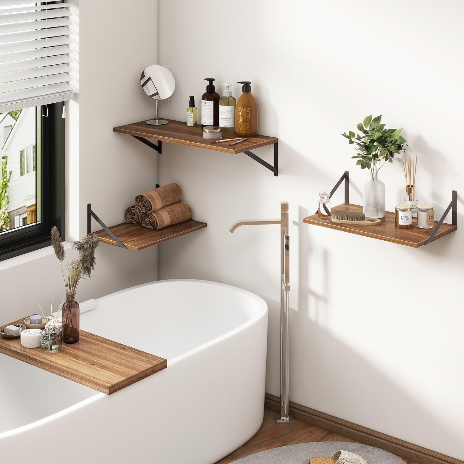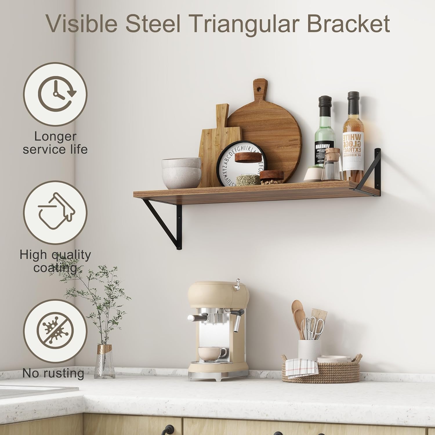 - γFARMHOUSE RUSTIC WALL SHELFγThese floating shelves are made of premium engineered wood board and visible triangular bracket. The rustic wooden grain surface add character and warmth to any modern or traditional interior with these deep floating shelves, contrast shelves at staggering heights on the wall or mount side-by-side or in the corner for a clean streamlined look.