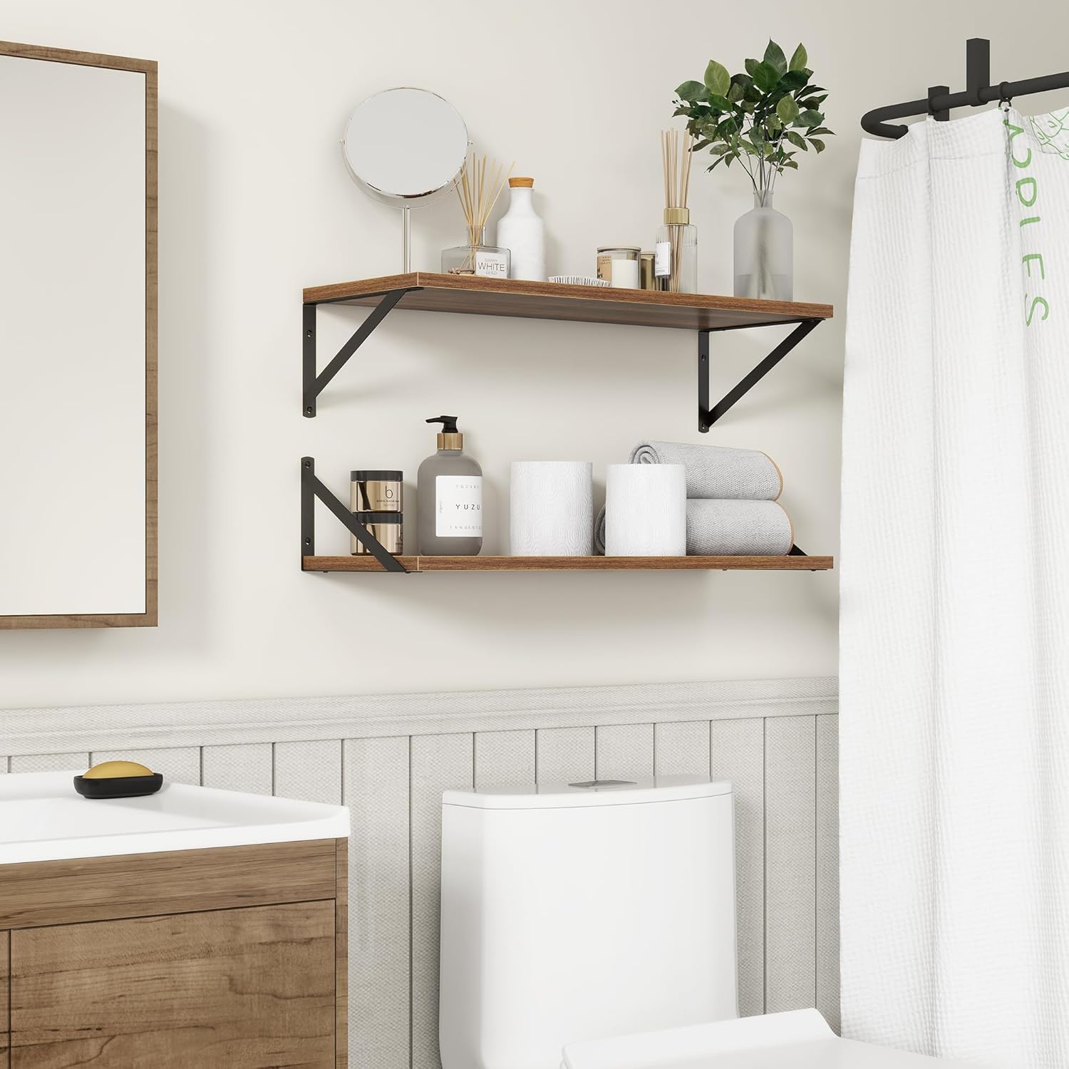 - 【DECORATIVE & FUNCTIONAL】The wall-mounted floating shelves are designed for decoration and storage, utilizing and decorating any space in your home. Used as shelf decor to show your collection, books, or prize, the hanging shelves are perfect for displaying your photo frame, small plants, model, or audio in your living room, office, study. And can also use as over the toilet storage shelf in the bathroom to hold toiletries or used as kitchen shelf to storage condiments.