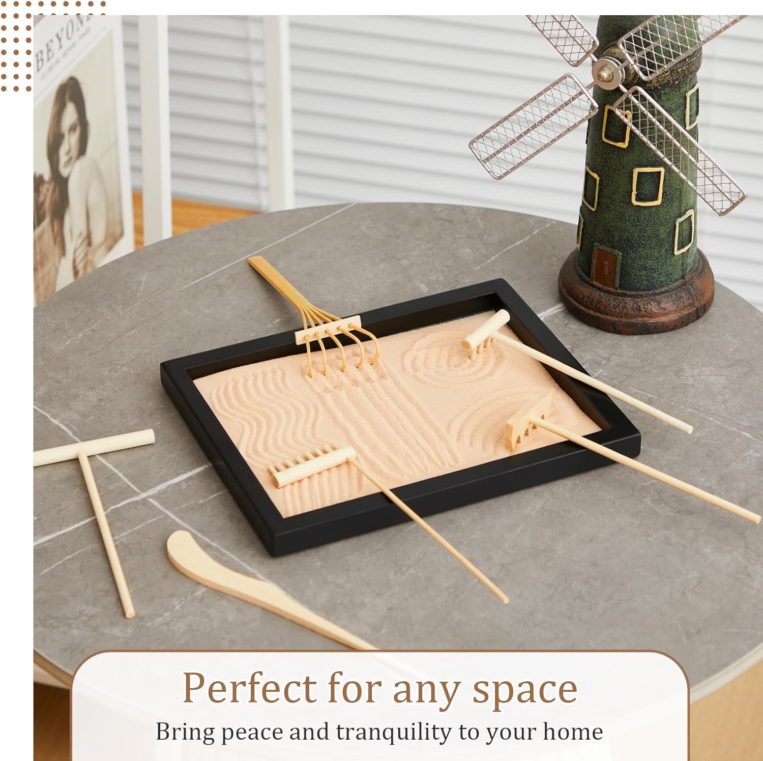 - Zen Serenity Kit: discover tranquility with our comprehensive mini zen garden kit, everything you need to DIY your own and create your serene space: 1 sand tray, 7 oz sand, 6 uniquely crafted rakes, ensuring endless creativity and peace at your fingertips