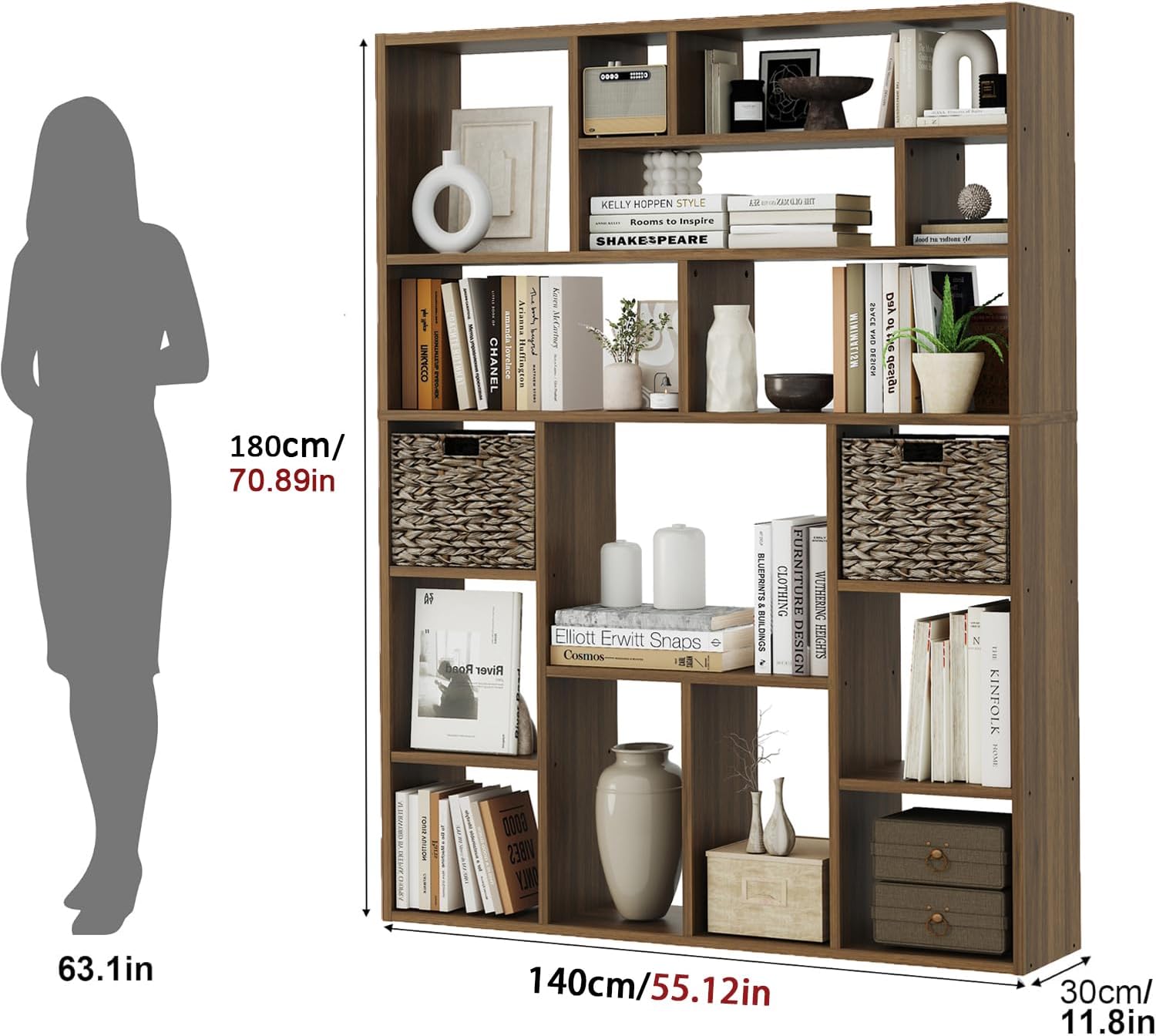 - Smart Storage Solution - The unique backless design with 16 irregularly arranged cubes (6 tiers total) offers versatile storage options, perfect for books, decor, and the included 2 premium foldable woven baskets that add both functionality and style.