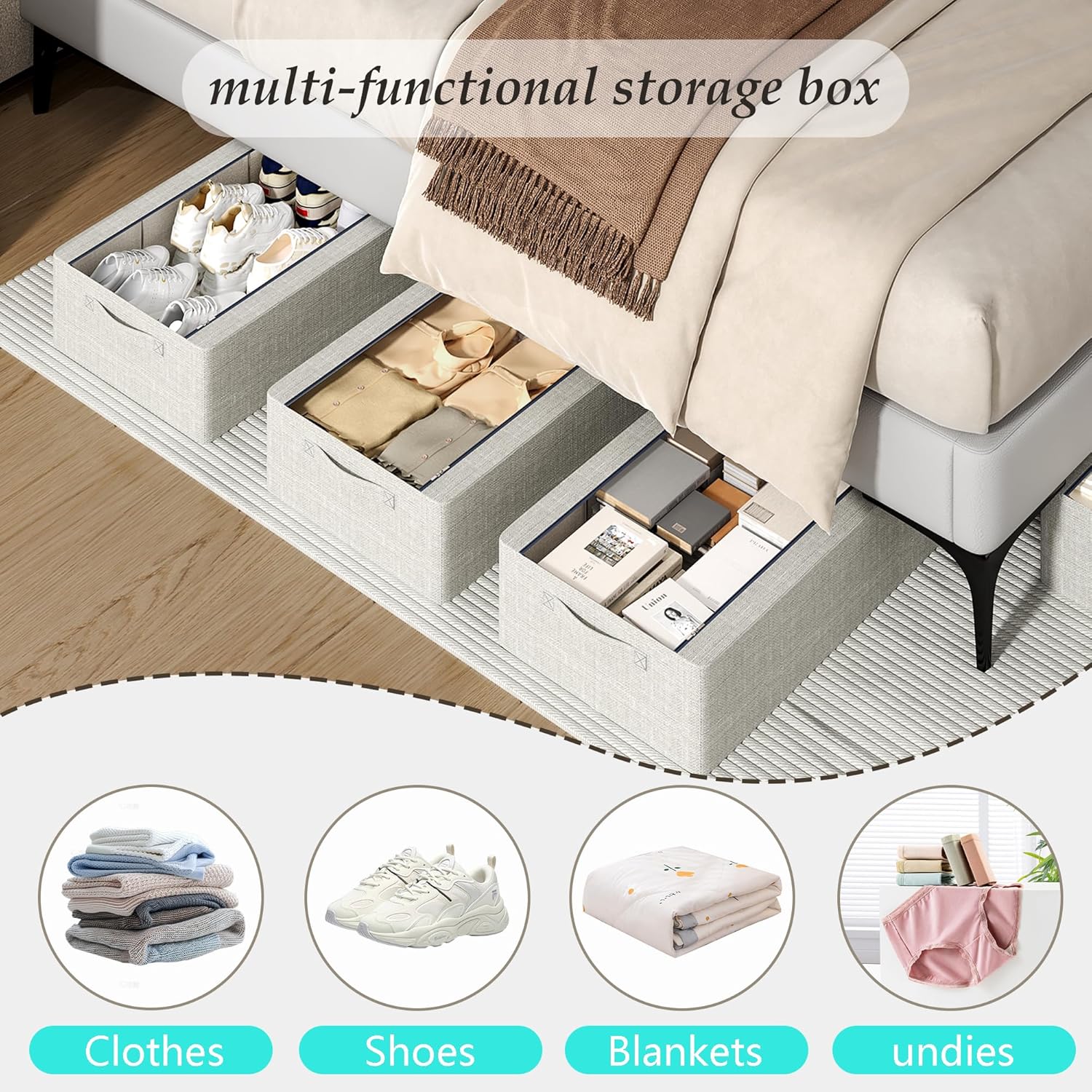 3PCS Under Bed Storage Bins with Metal Frame, Linen Fabric Frame Storage Box Clothes Organizer Bins, Underbed Container with Clear Window (Light Grey, 15.7 x 13 x 6IN)