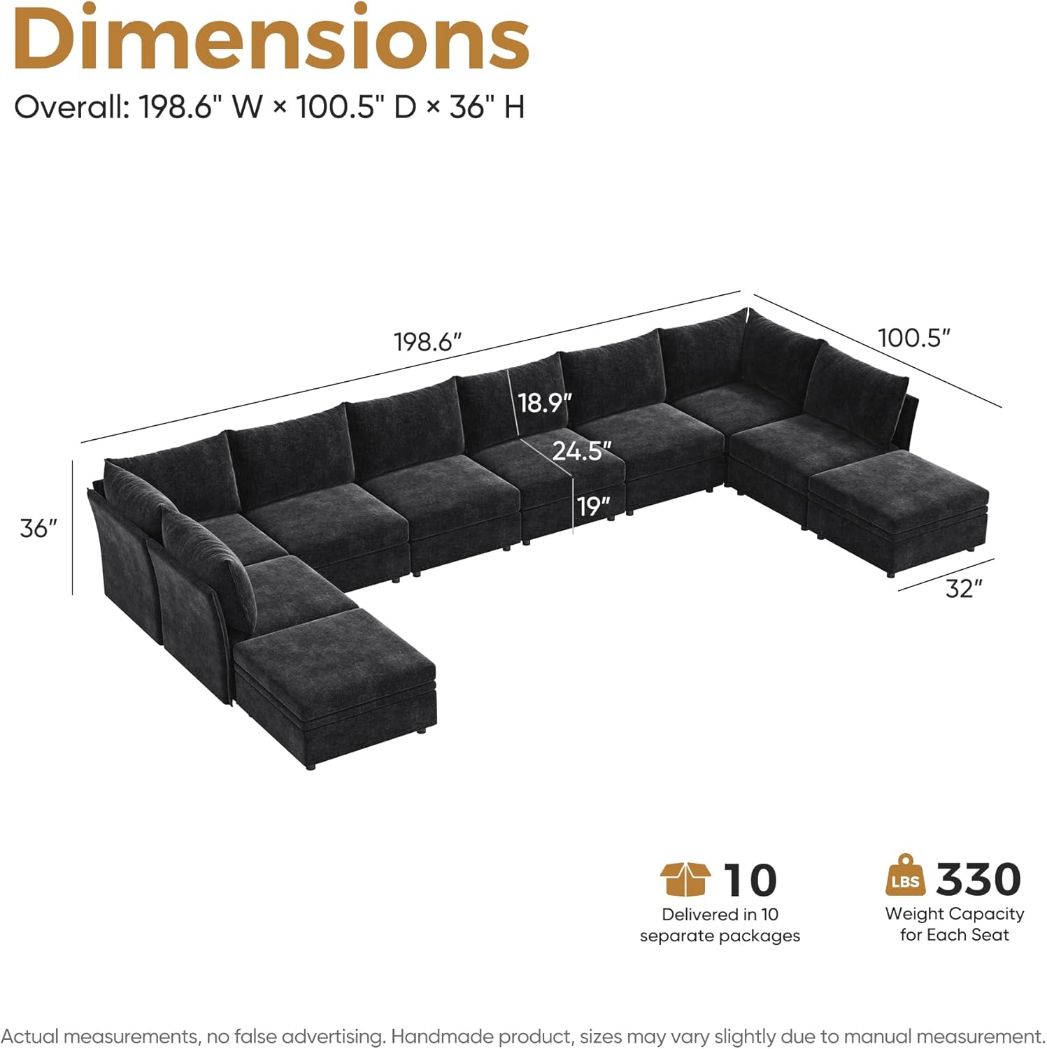 198.6" Oversized Modular Sectional Sofa, U Shaped Convertible Couch with Movable Ottoman, Large 10 Seats Corner Couches for Living Room Deep Seat Black Chenille