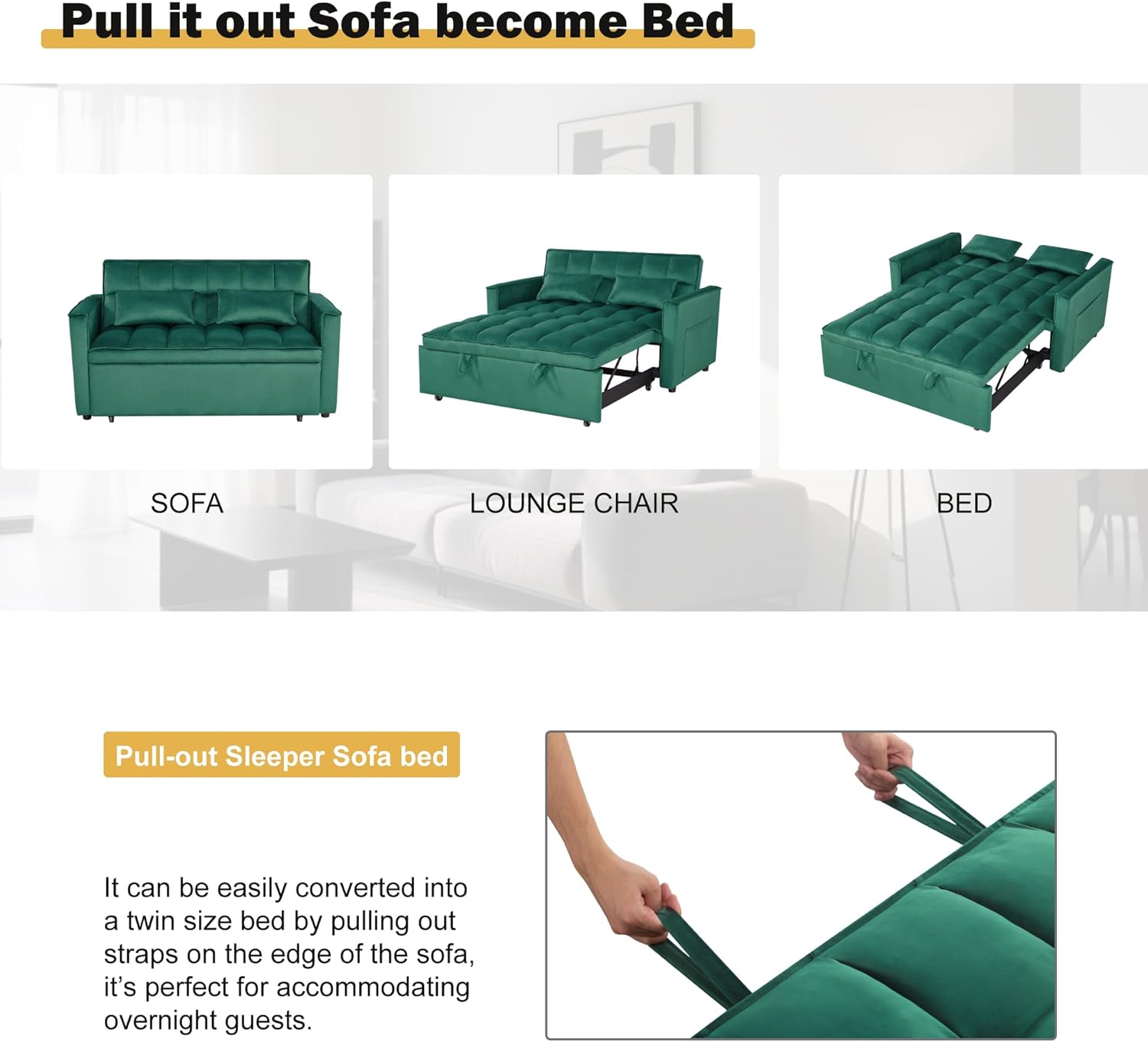 3 in 1 Sleeper Sofa Bed, Futon Sofa Bed for Living Room with Side Pocket, Green Sleepers Sofas Couch with Pullout Beds, Convertible Love Seat Sleepers Couch for Living Room, Bedroom