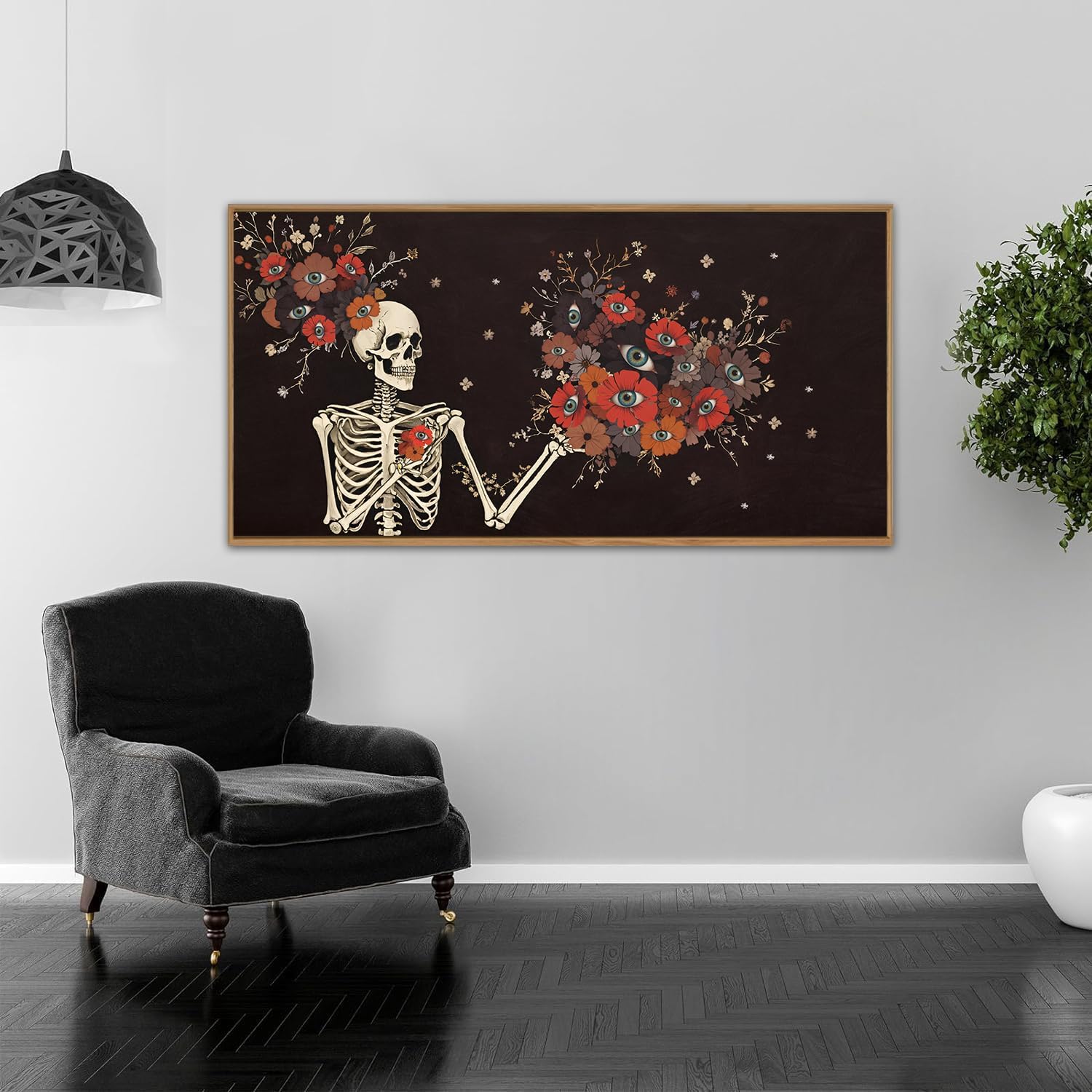 KAIRNE Halloween Skeleton Wall Art,Gothic Skull Canvas Set of 1(40”x20”),Romantic Spooky Floral Botanical Print,Scary Skull Painting,Horror Halloween Wall Art for Living Room Bedroom Goth Party Decor