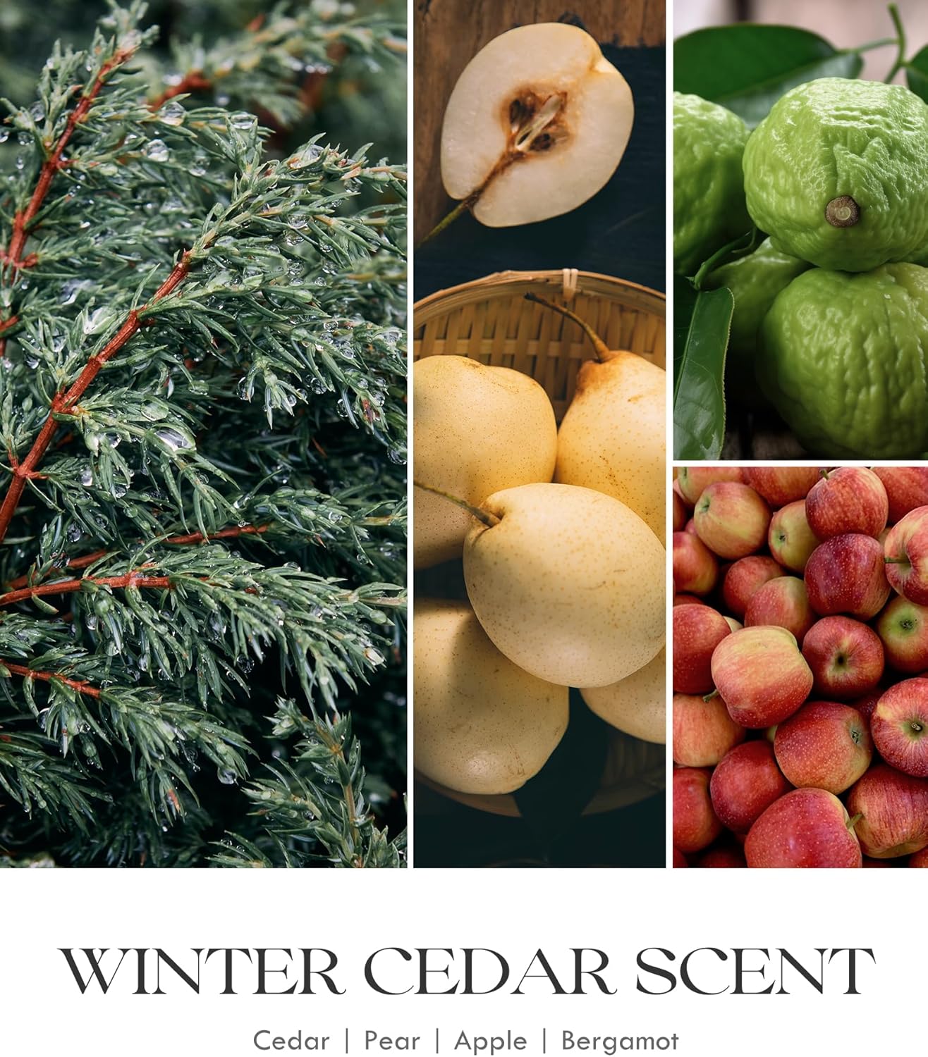 - HIGHLY SCENTED CEDAR CANDLE: Christmas Pine Scented CandleInfused with the enchanting scent of crisp pear, juicy apple, and bright bergamot, layered with fir, pine, and warm cedarwood, this candle captures the heart of a snowy forest retreat. Finished with amber undertones, it's the perfect Christmas candle to create a peaceful winter escape at home. Whether you're decorating for the holidays or searching for Christmas gifts for women or mom, this scented candle delivers seasonal comfort and luxury