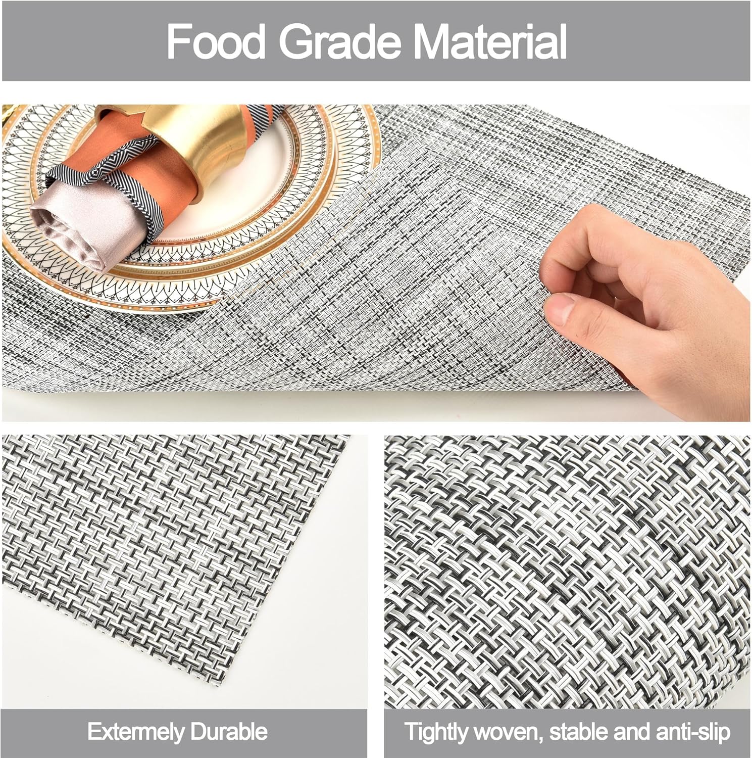 - Environmentally Material: 70% PVC and 30% Polyester. PVC materials are used for the placemats, very durable, flame-retardant, no fading and heat resistant, very safe to use, all placemats are cut by machine with no rough selvedge, free bending, free cutting. Placemats for dining table set of 8, they are the best decoration and protection for your dining table