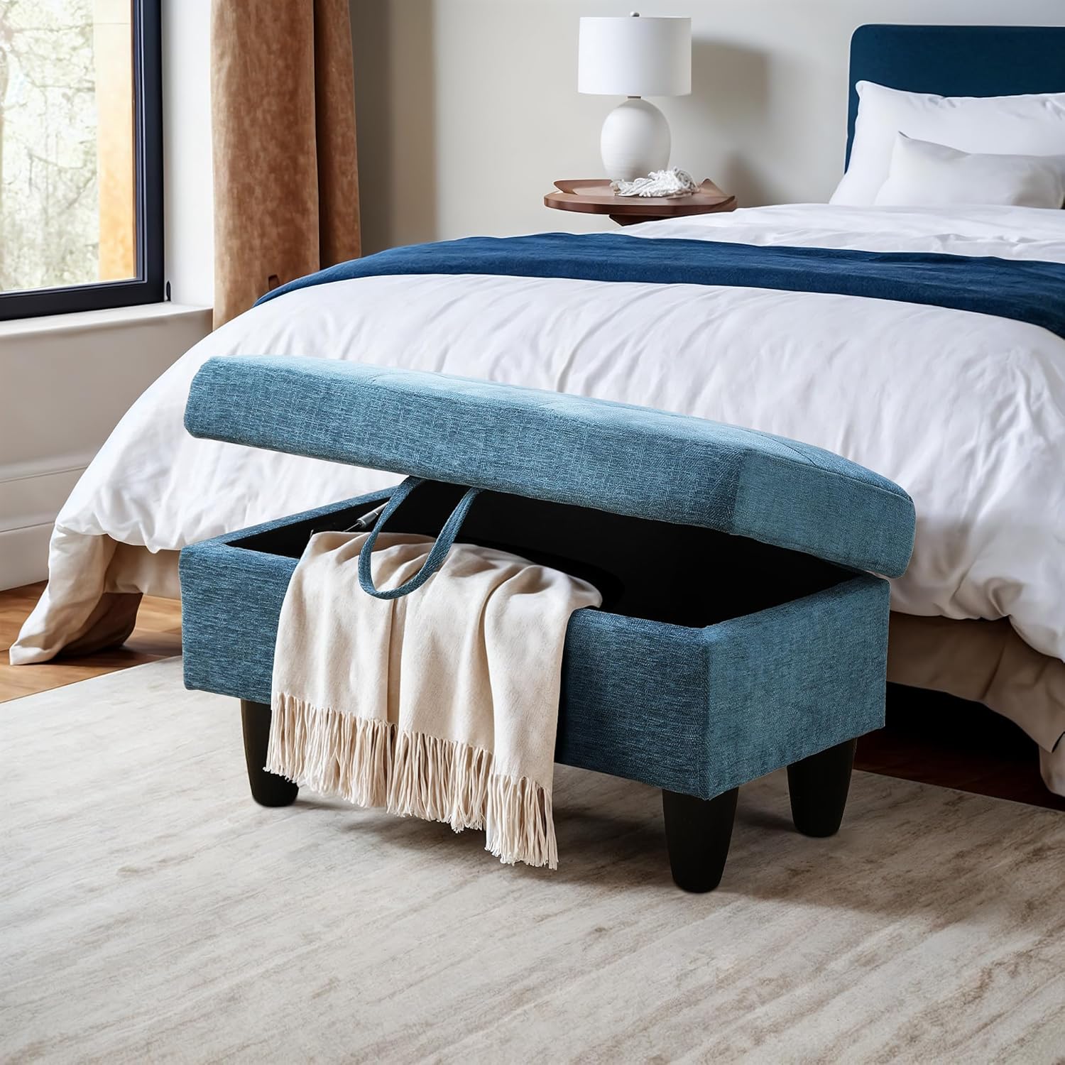 - AMPLE STORAGE: This ottoman offers generous storage capacity for items like pillows, blankets, shoes, seasonal decor, books, toys, and more. Designed with convenient hinges, the lid stays open smoothly and closes gently with a soft-close mechanism. Ideal for organizing your living space.