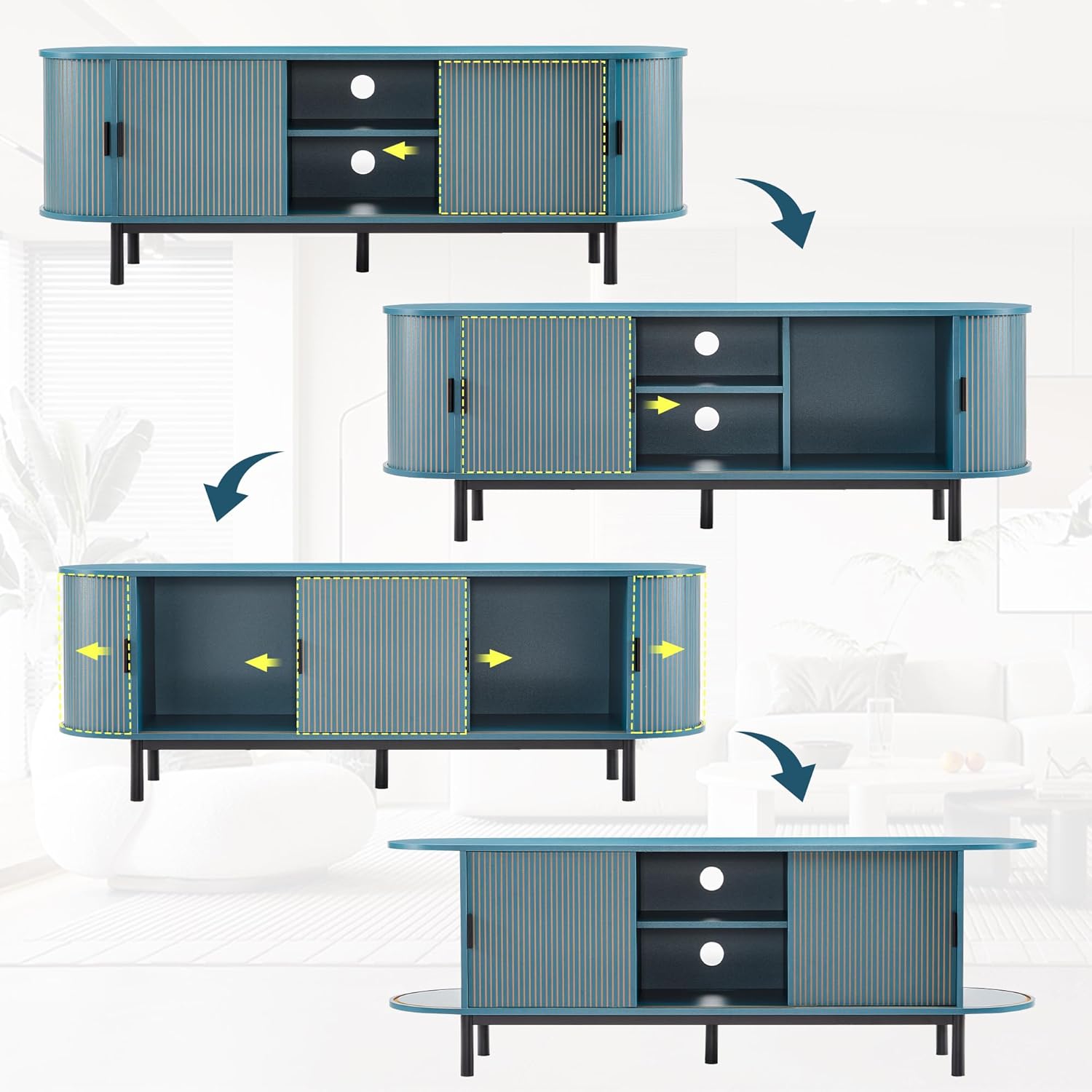 - Elegant Fluted Design: This TV stand showcases a captivating slatted roller shutter sliding door design, perfectly paired with a sleek curved profile. The elegant tambour doors not only enhance the aesthetic appeal but also allow for seamless access to your media devices while adding a modern touch to any living space.